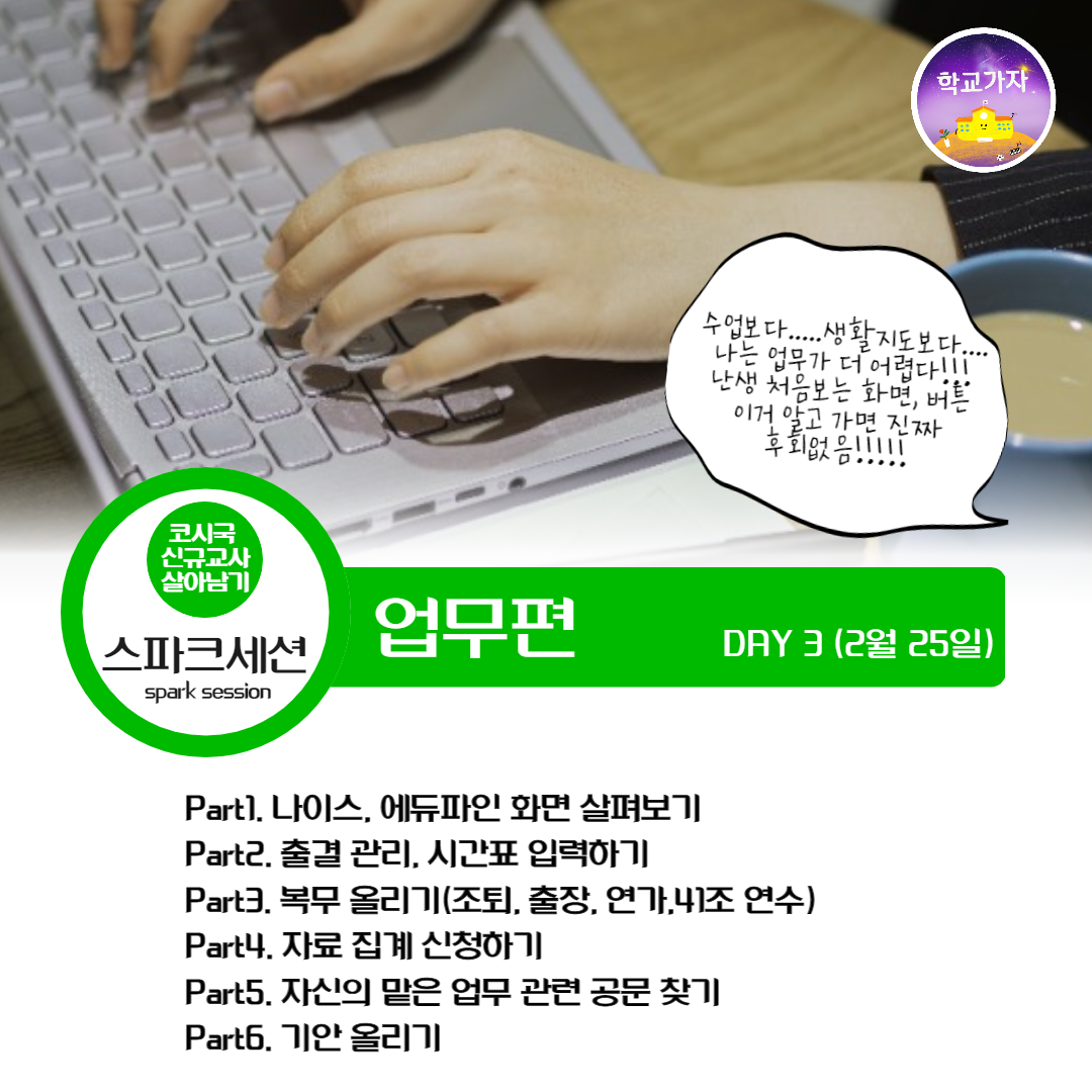 3일차는 [업무편]으로 교사들의 업무 플랫폼인 'NEIS' 와 '에듀파인' 기능 소개와 기안 작성법 등의 실질적인 tip을 알려드릴 예정입니다.