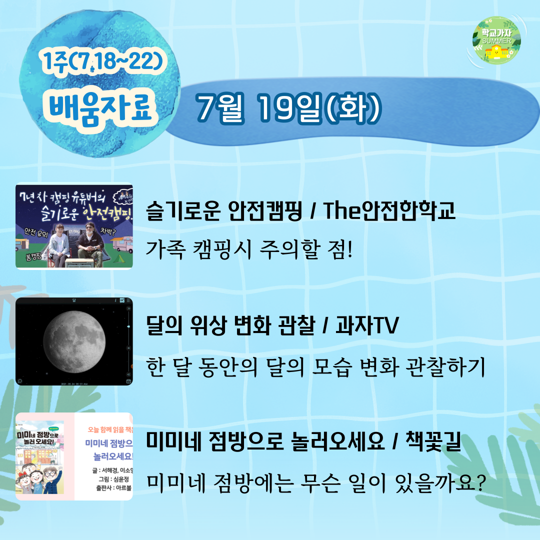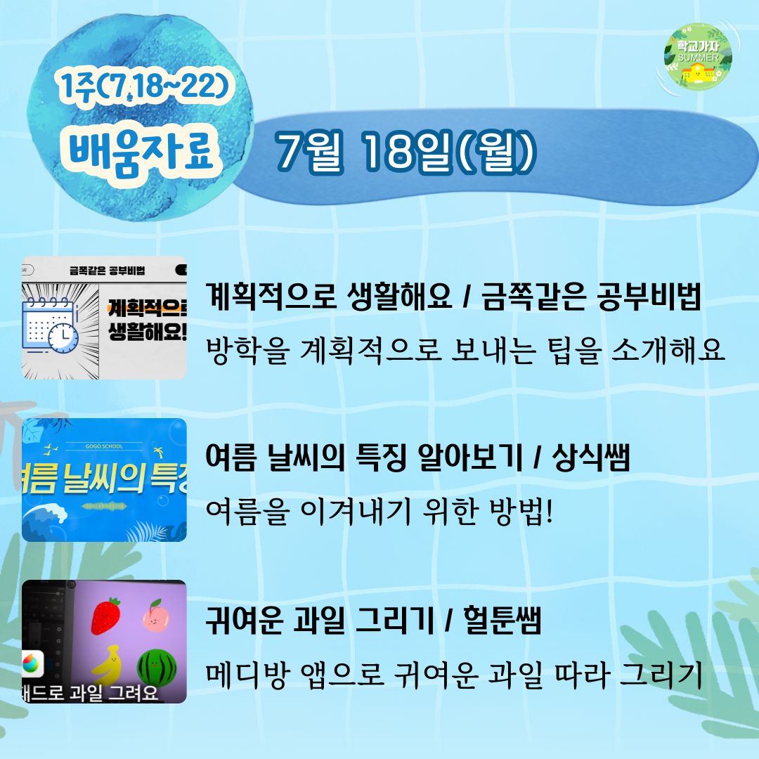 1주(7.18~7.22)은 "스스로 성장하는 즐거운 여름방학"을 주제로 준비하였습니다.