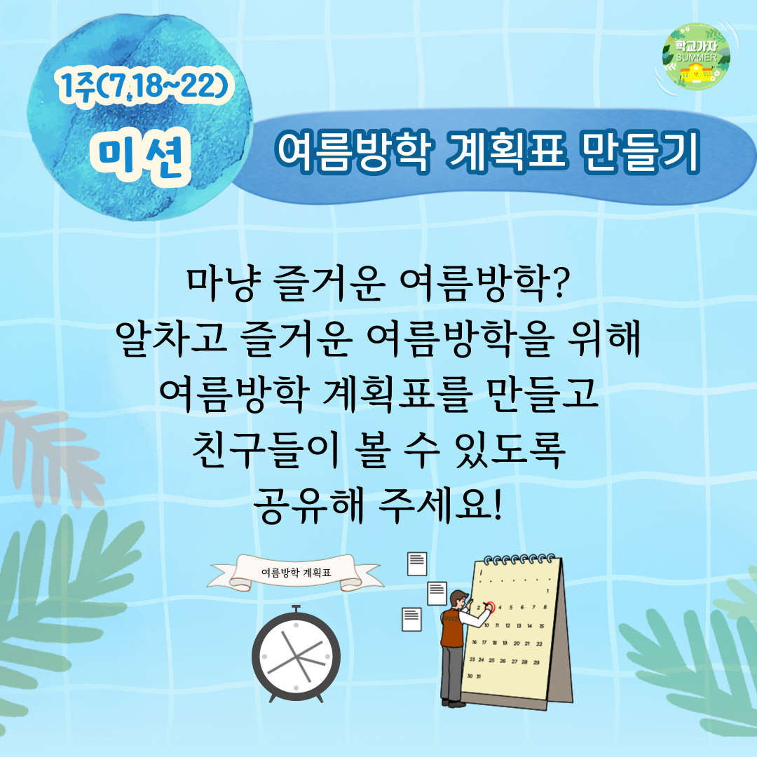 올해도 다시 돌아온 학교가자닷컴 여름캠프를 소개합니다! 2022년 7월 18일(월)부터 8월 27일(금)까지 6주간 실시되는 이번 여름캠프는 지난해 실시된 여름캠프 미션을 다듬고 매일 배움자료를 보