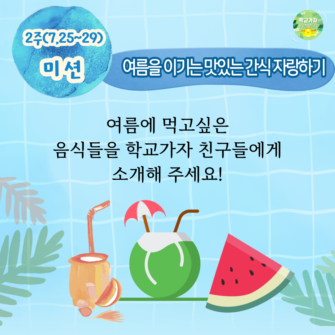 2주(7.25~29)는 "여름을 이기는 맛있는 간식 자랑하기"를 주제로 준비하였습니다.
