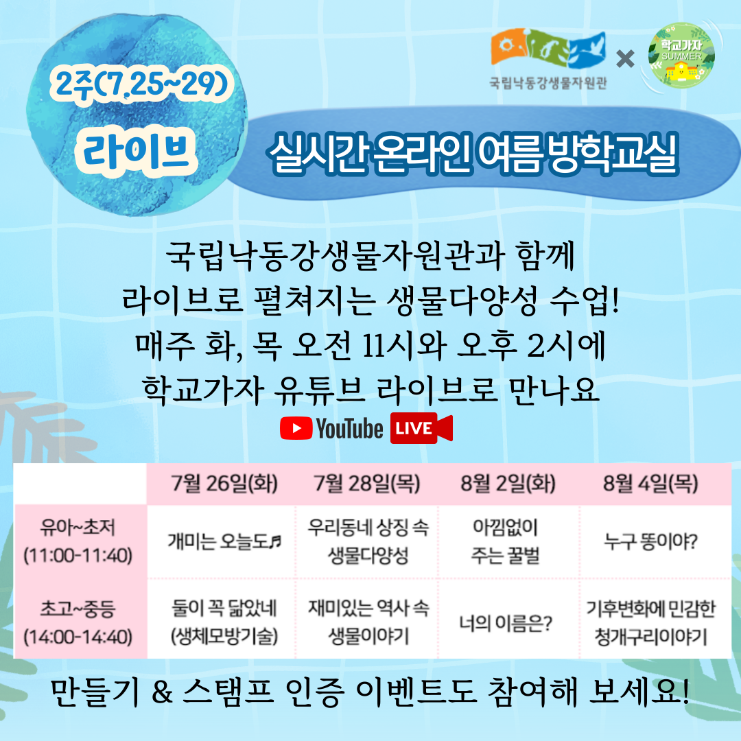 실시간 온라인 여름방학교실 안내(국립낙동강생물자원관 공지사항 & 학교가자닷컴 유튜브 라이브)