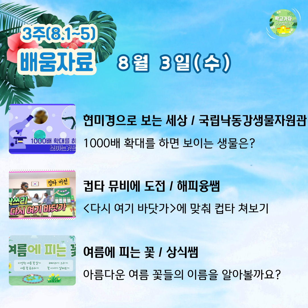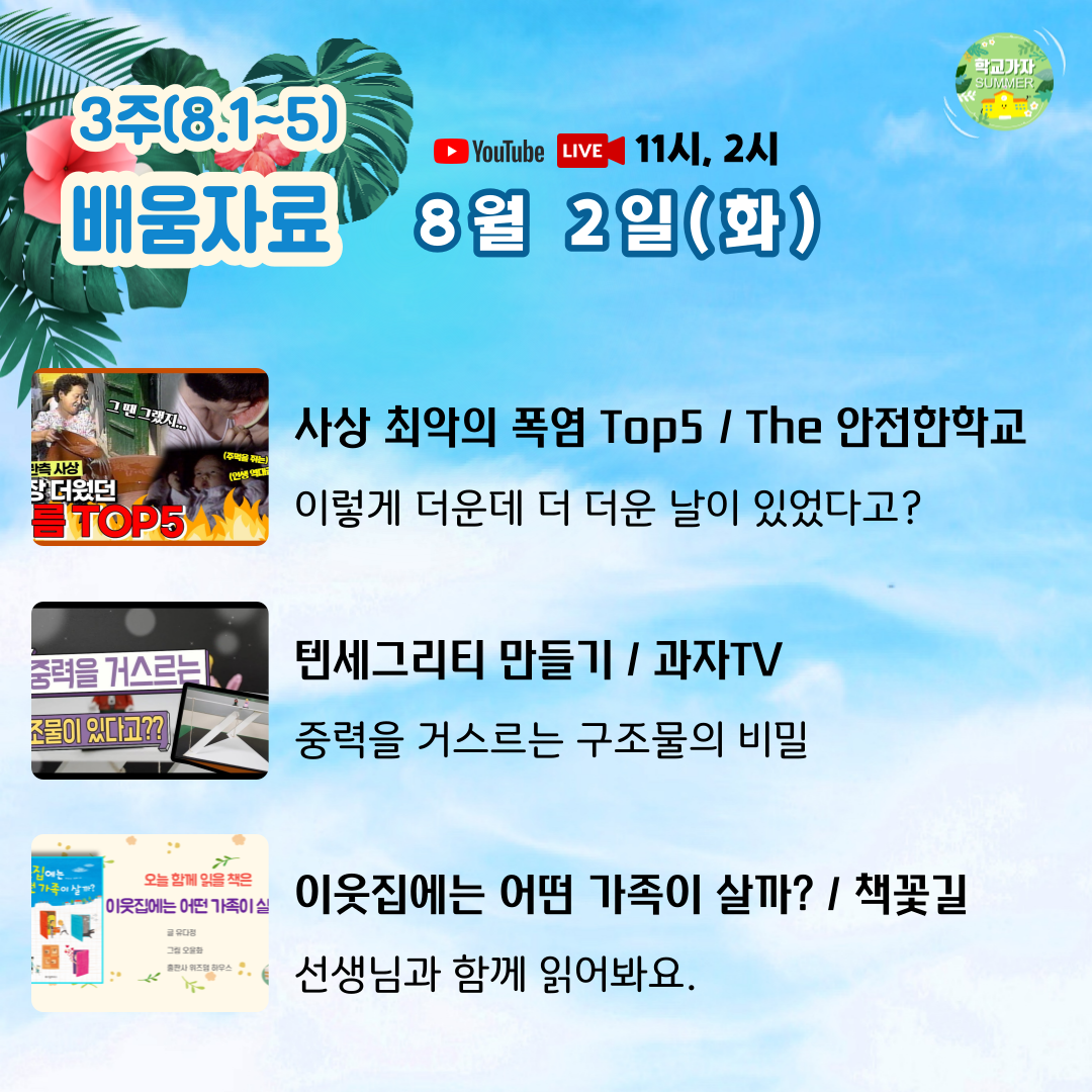 이번 주에도 화요일과 목요일 각각 오전 11시와 오후 2시에 '실시간 온라인 여름방학교실' 라이브 방송을 기대해 주세요!