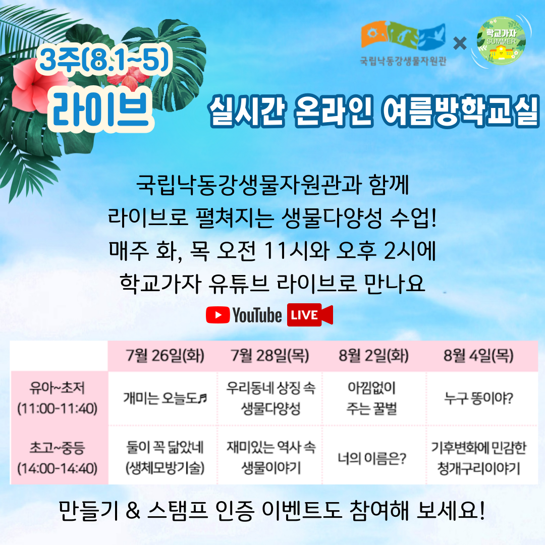 실시간 온라인 여름방학교실 안내(국립낙동강생물자원관 공지사항 & 학교가자닷컴 유튜브 라이브)