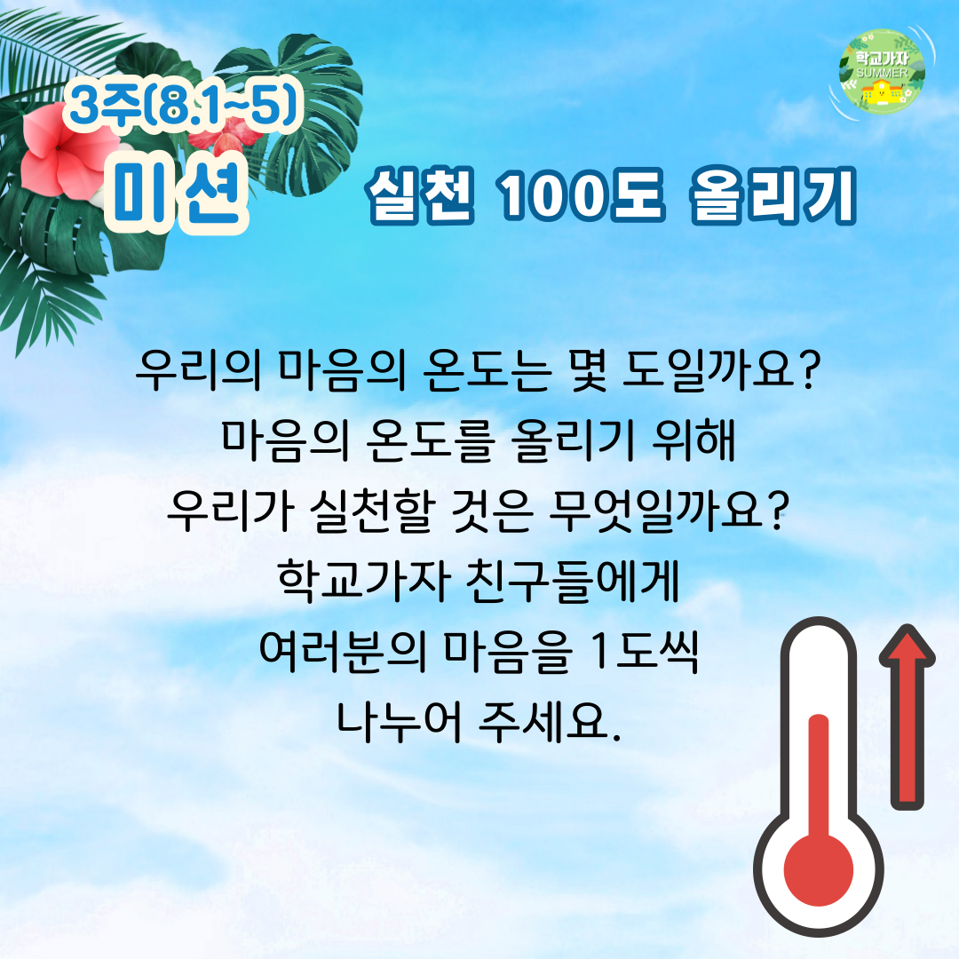 3주(8.1~5)는 "온도가 느껴지는 여름방학"를 주제로, '실천 100도 올리기'를 미션으로 한 주의 배움자료를 준비하였습니다.