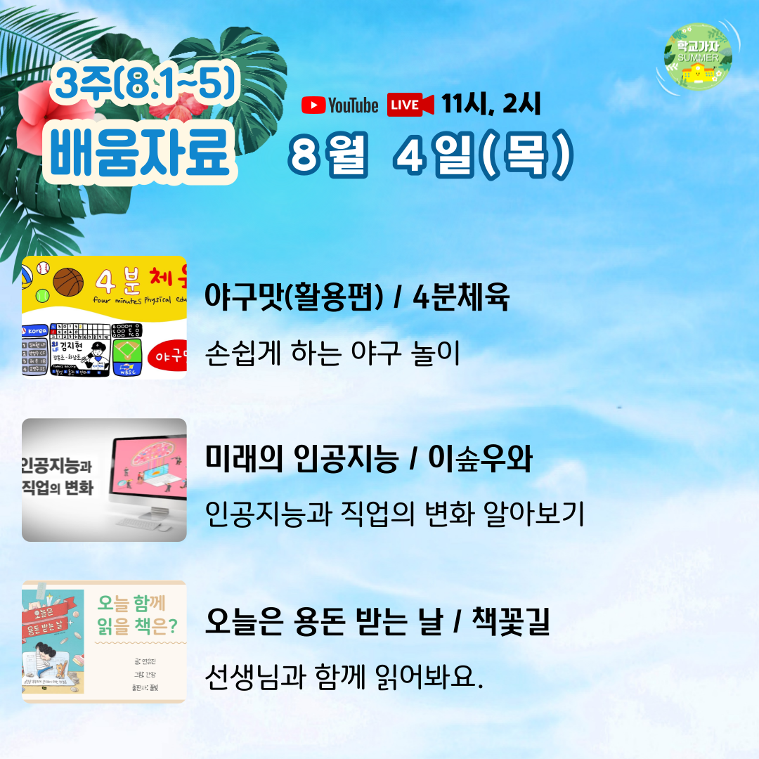 이번 주에도 화요일과 목요일 각각 오전 11시와 오후 2시에 '실시간 온라인 여름방학교실' 라이브 방송을 기대해 주세요!