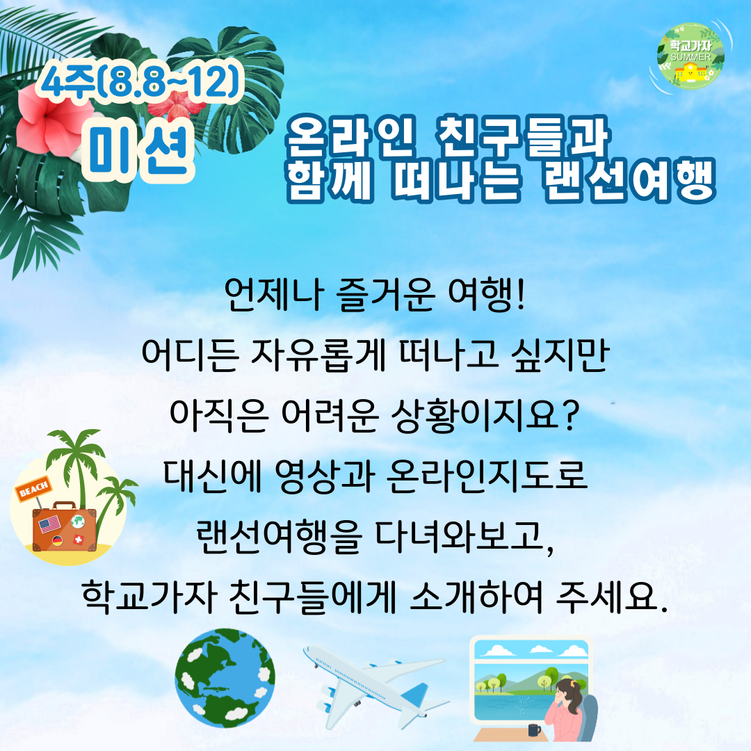 4주(8.8~12)는 "우리들의 랜선여행"를 주제로, '온라인 친구들과 함께 떠나는 랜선여행'을 미션으로 한 주의 배움자료를 준비하였습니다.
