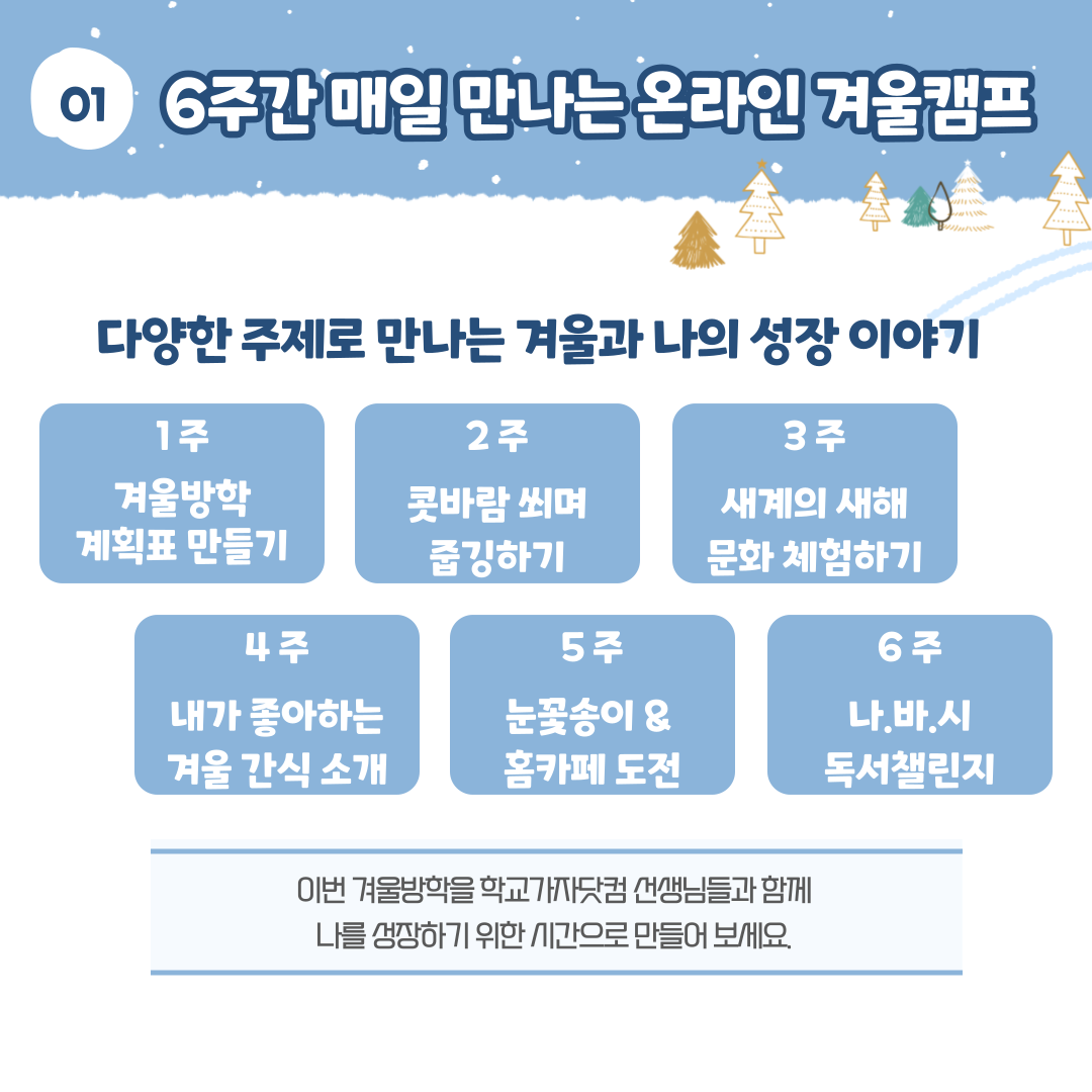 2022 초등 학교가자 온라인 겨울캠프 1주 [스스로 성장하는 즐거운 겨울방학] (0) | 2022.12.18 |