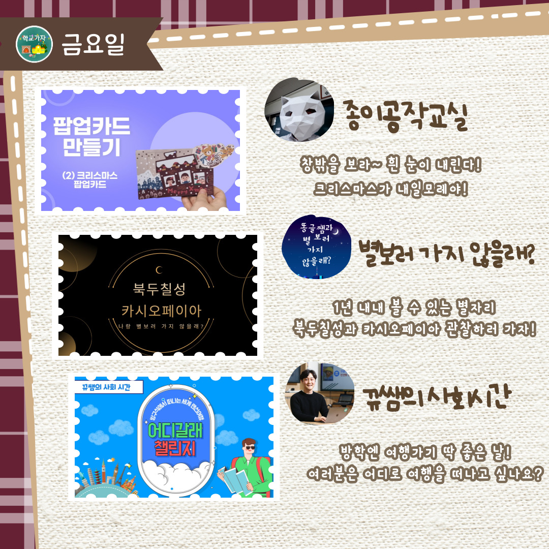1주(12.19~12.23)는 "스스로 성장하는 즐거운 겨울방학"을 주제로 준비하였습니다.