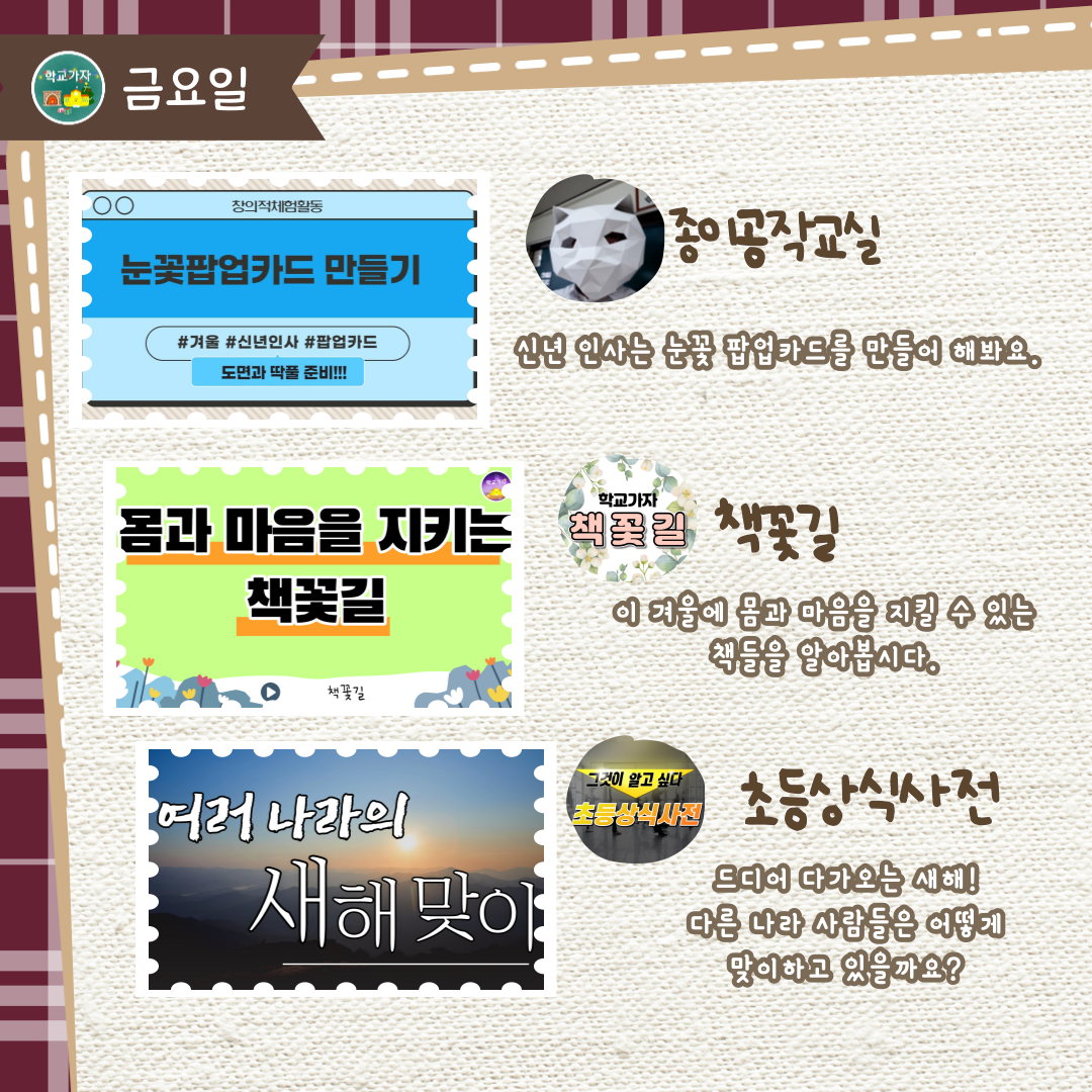 2주(12.26~12.30)는 "춥지만 활기찬 겨울방학 생활"을 주제로 준비하였습니다.
