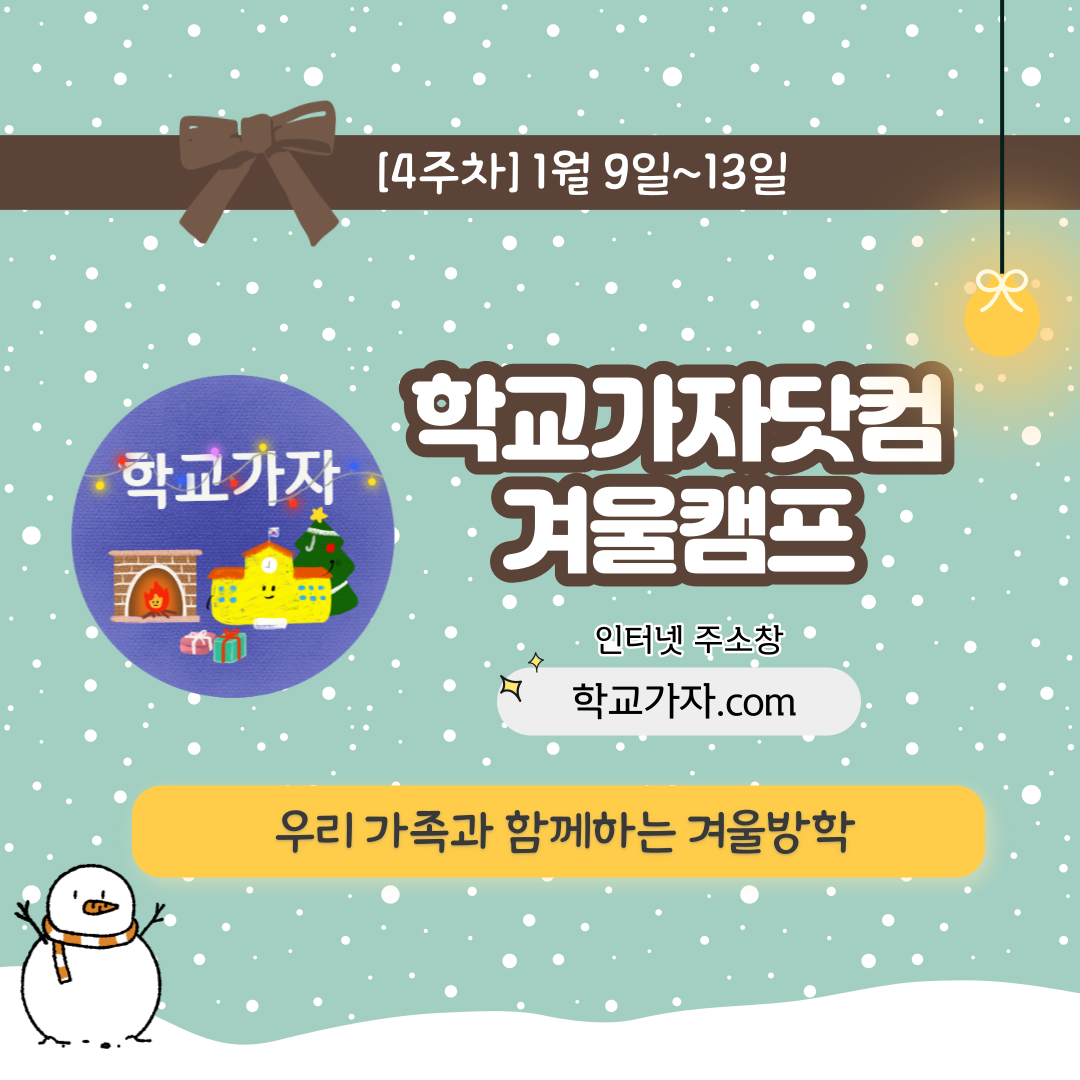 올해도 다시 돌아온 학교가자닷컴 온라인 겨울캠프를 소개합니다! 2022년 12월 19일(월)부터 2023년 1월 27일(금)까지 6주간 실시되는 이번 여름캠프는 지난해 실시된 겨울캠프 미션을 다듬고 매일