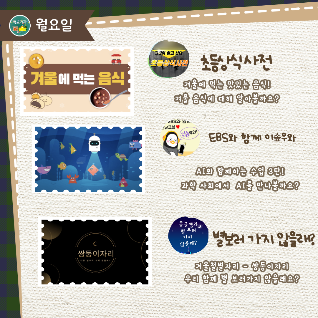 4주(1.9~1.13)은 "우리 가족과 함께하는 겨울방학"을 주제로 준비하였습니다.