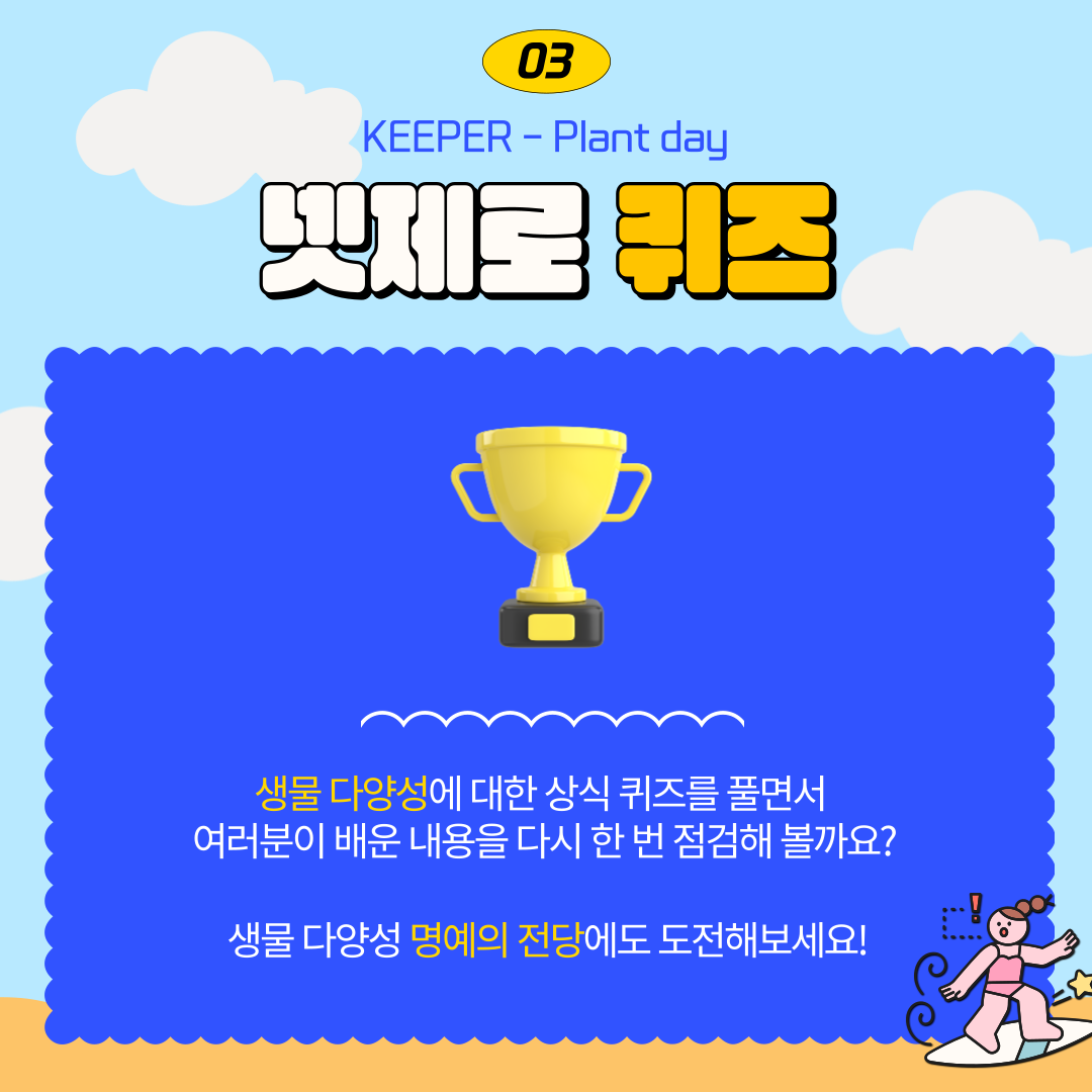 '넷제로'를 위한 네번째 단계, [생물 다양성]을 위한 상식, 미션, 퀴즈가 준비되어 있습니다.