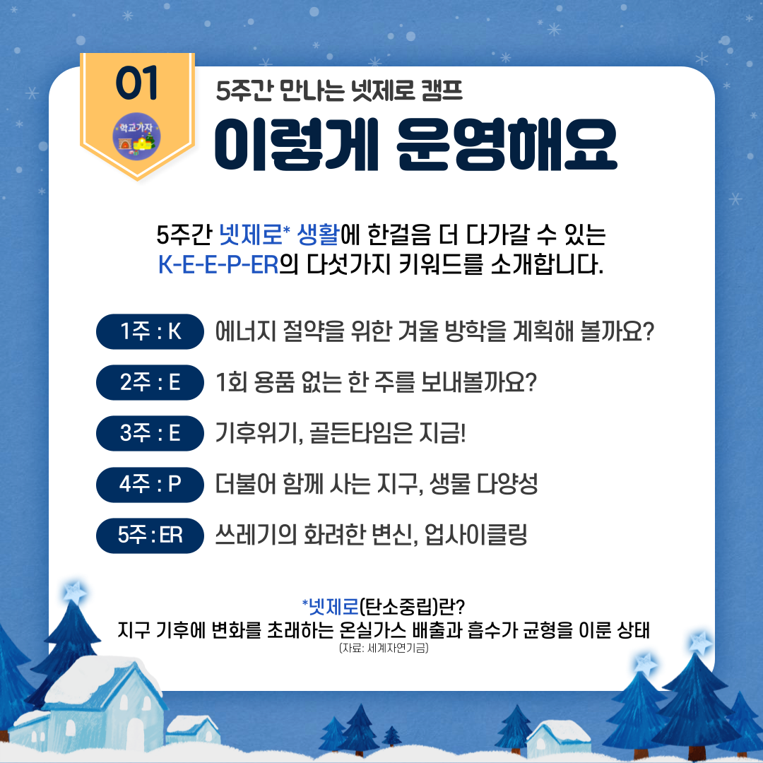 여름과 동일하게 "지속가능한 내일을 위한 넷제로 캠프"를 주제로 5주간 운영합니다.
