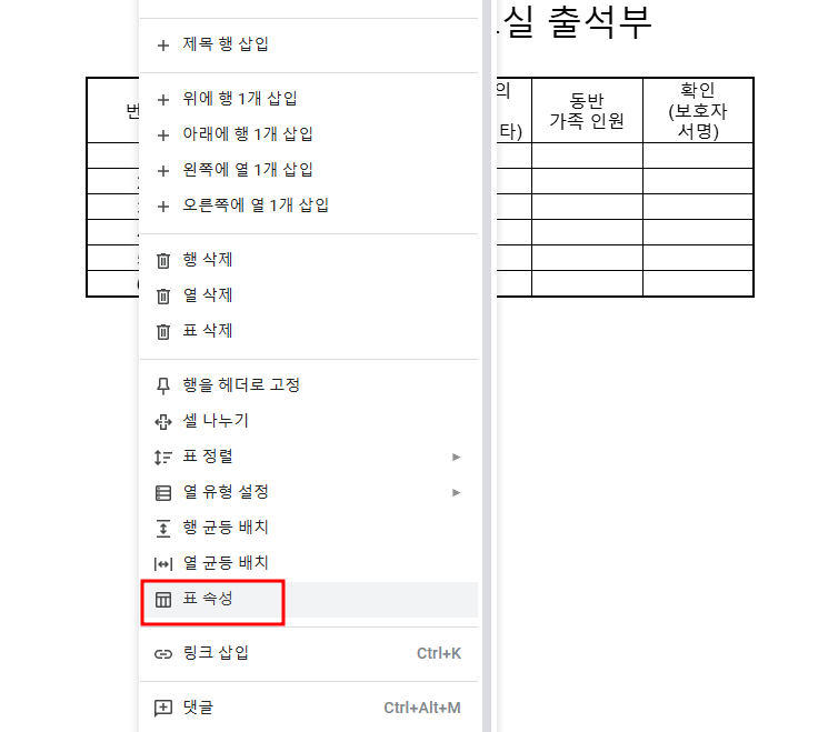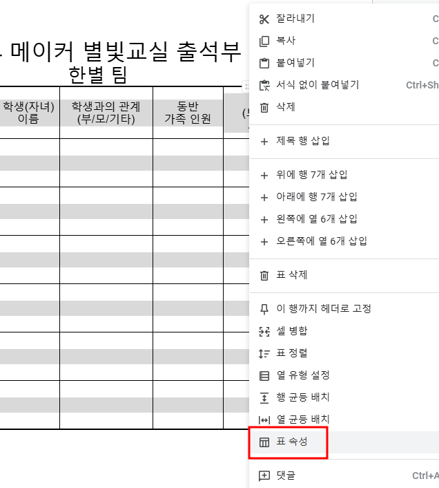 표의 아무 칸이나 누른 후 마우스 오른쪽을 누릅니다. 그 중 '표 속성'을 누릅니다.