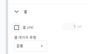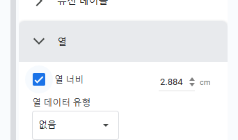 '열'에서 '열 너비' 옆 체크 박스를 풀어줍니다. 자동으로 균등 배치됩니다.