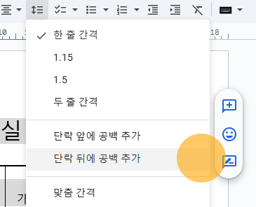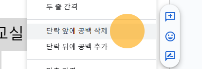 '단락 앞에 공백 추가'를 누릅니다. 다시 '줄 및 단락 간격'에서 '단락 앞에 공백 삭제'를 눌러 삭제된 상태로 만듭니다.