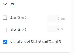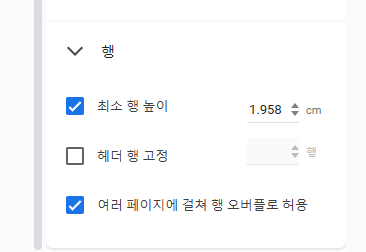 '행'에서 '최소 행 높이' 옆 체크 박스를 풀어줍니다. 자동으로 균등 배치됩니다.