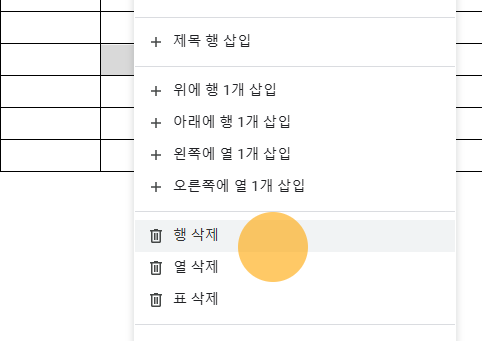 특정한 행이나 열을 삭제하고 싶을 때에는 원하는 칸을 누르고 '행 삭제', 열 삭제'를 누릅니다.