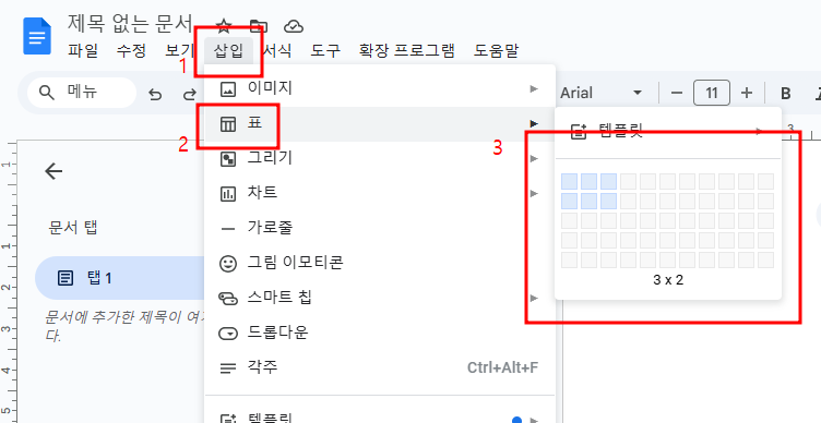 구글 문서에서 '삽입', '표'를 순서대로 눌러줍니다.