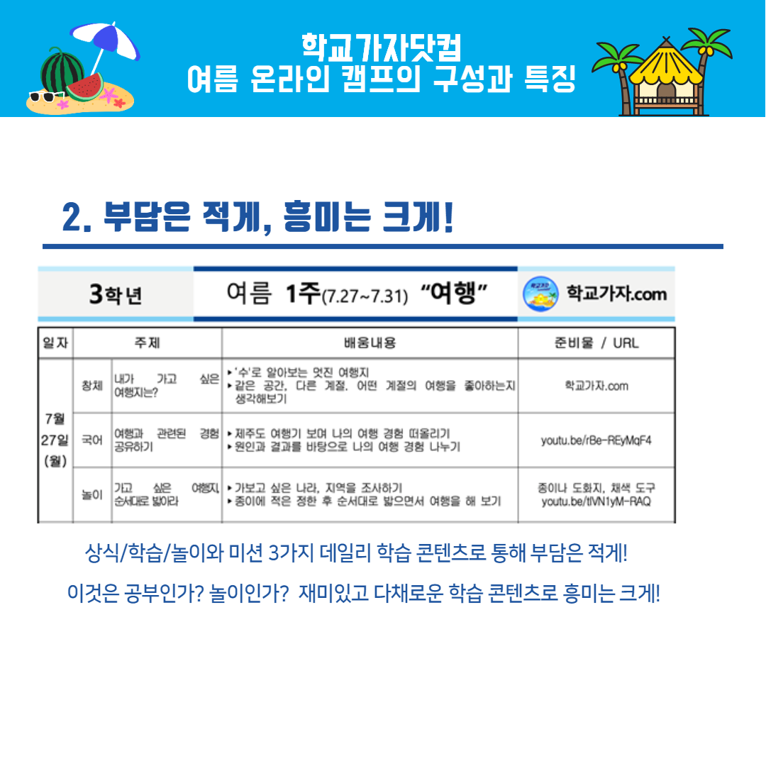 학교가자 온라인 여름 캠프는 3월의 학교가자처럼 교과 학습과 학생 활동 그리고 미션 중심으로 된 일일 학습 콘텐츠를 학생들에게 제공하고 하루에 1번 '깊은 공부'를 한다기 보다는 '즐겁게 놀며 배운다.'라는 컨셉으로 기획하였습니다.