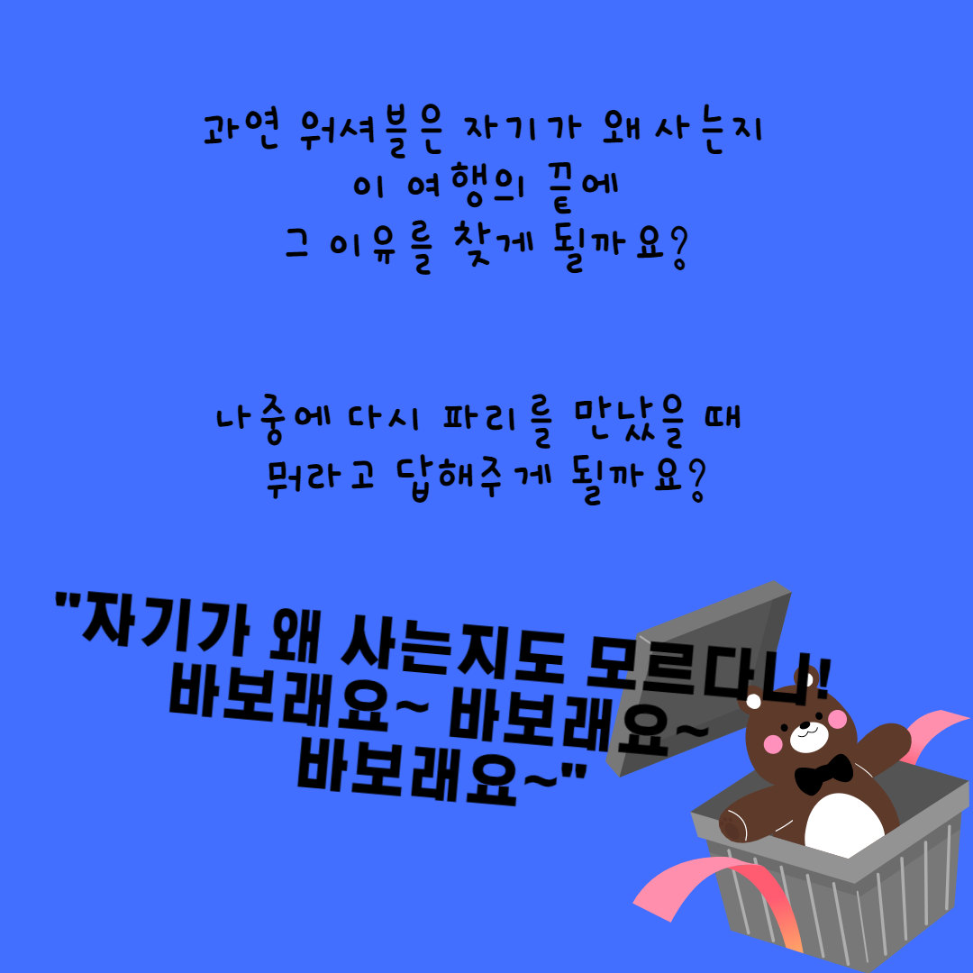 만약 곰돌이 워셔블이 우리집에 찾아와서 “너는 왜 사니?”라고 물어보면 나는 뭐라고 대답해줄 건가요?