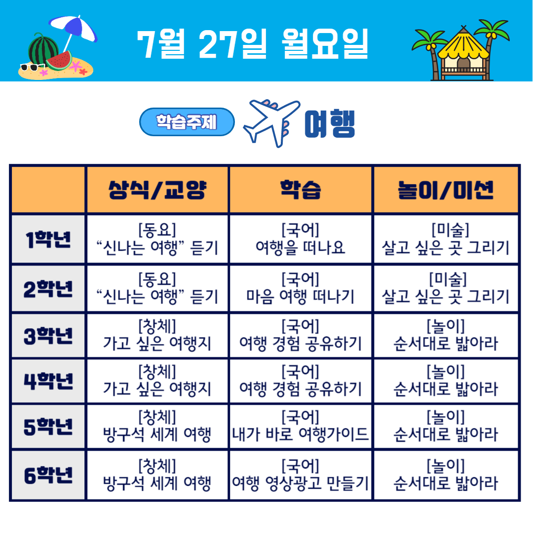 여름방학 1주차 (7.27-7.31) 학교가자 주제중심 프로젝트, 여행편 학습계획을 안내합니다.