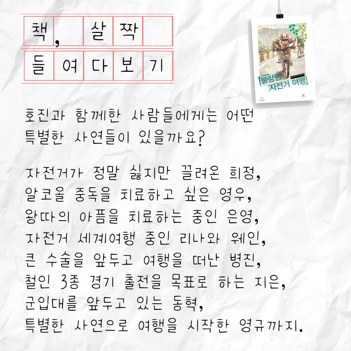 여러분들이 <불량한 자전거 여행> 책을 읽는 모습이 궁금해요. 구글 포토에 인증샷을 한번 남겨 볼까요? 학교 도서관에서 빌린 책, 공공 도서관에서 빌린 책, 직접 구입한 책 등 어떤 것도 괜찮아요. 내가 읽고 있는 책의 모습을 사진으로 담아 구글 포토에 공유해 주세요. 방학 기간, 나와 함께 같은 책을 읽고 있는 친구들을 만날 수 있을 거예요!