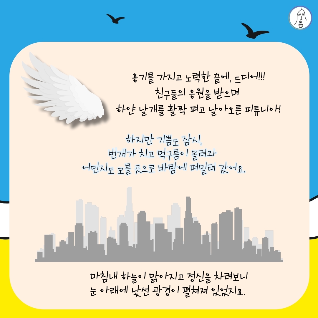 이 책에는 하늘을 날지 못하던 피튜니아가 하늘을 날아 도시로 여행을 가서 겪는 에피소드들이 들어 있어요.