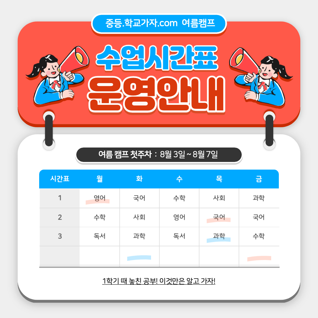 학교가자 선생님이 알려주는 중학교 공부비법! 이번 여름방학을 알차게 보내고 싶은 중학생이 있다면, 7월 27부터 3주간 실시하는 중등.학교가자.com 의 여름캠프로 찾아오세요!