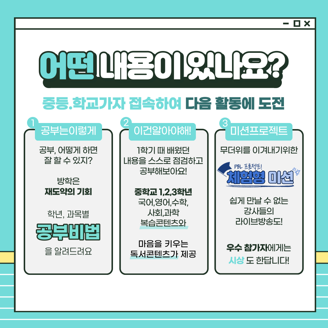 - 2-3주 : 이건 알아야 해 - 중학교 1~3학년 국어, 영어, 수학, 사회, 과학 선생님들의 복습 콘텐츠 및 마음을 키우는 독서콘텐츠가 제공됩니다.