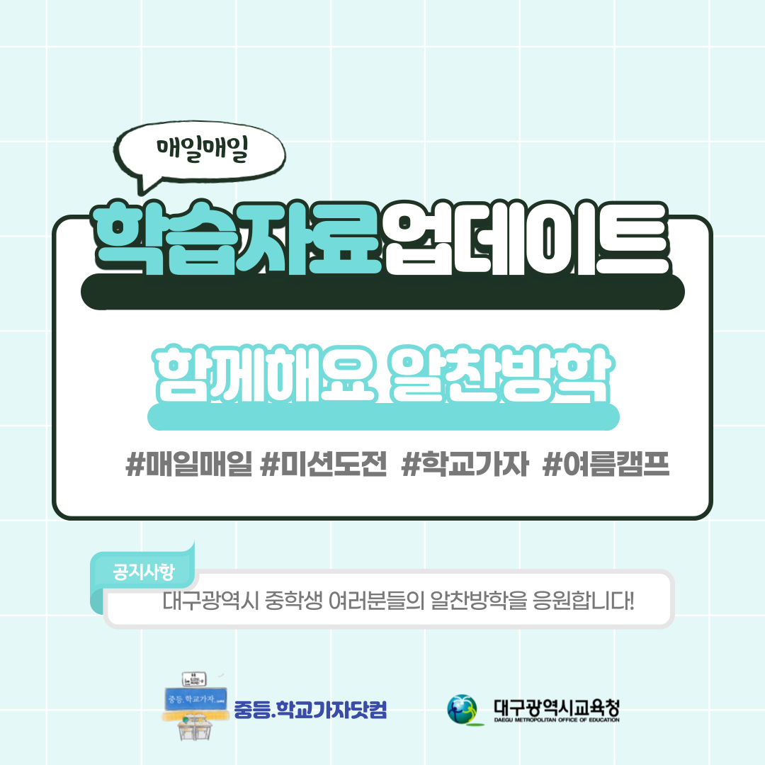 학교가자 선생님이 알려주는 중학교 공부비법! 이번 여름방학을 알차게 보내고 싶은 중학생이 있다면, 7월 27부터 3주간 실시하는 중등.학교가자.com 의 여름캠프로 찾아오세요!