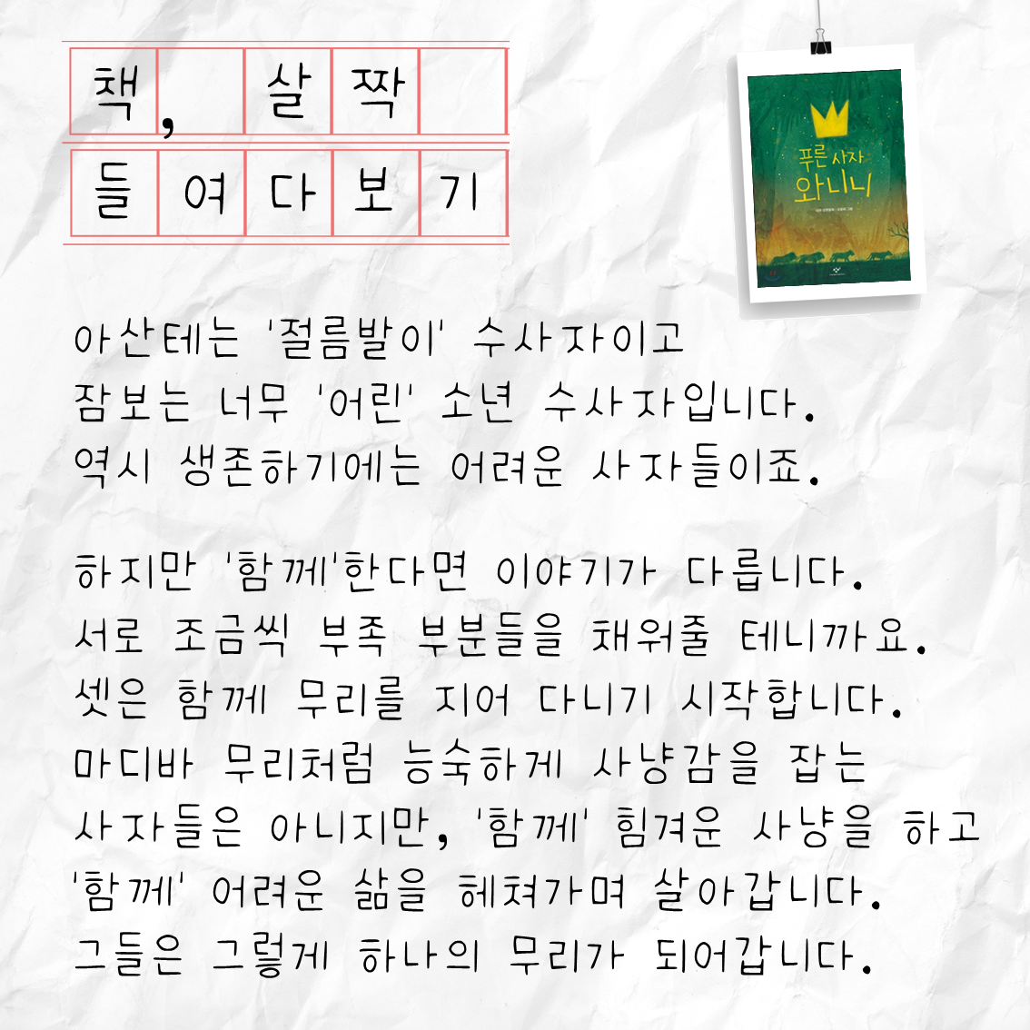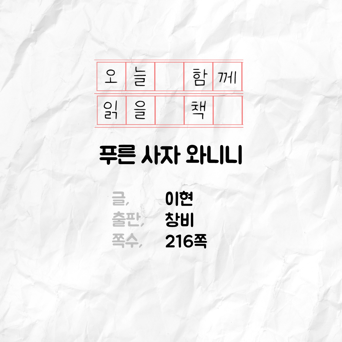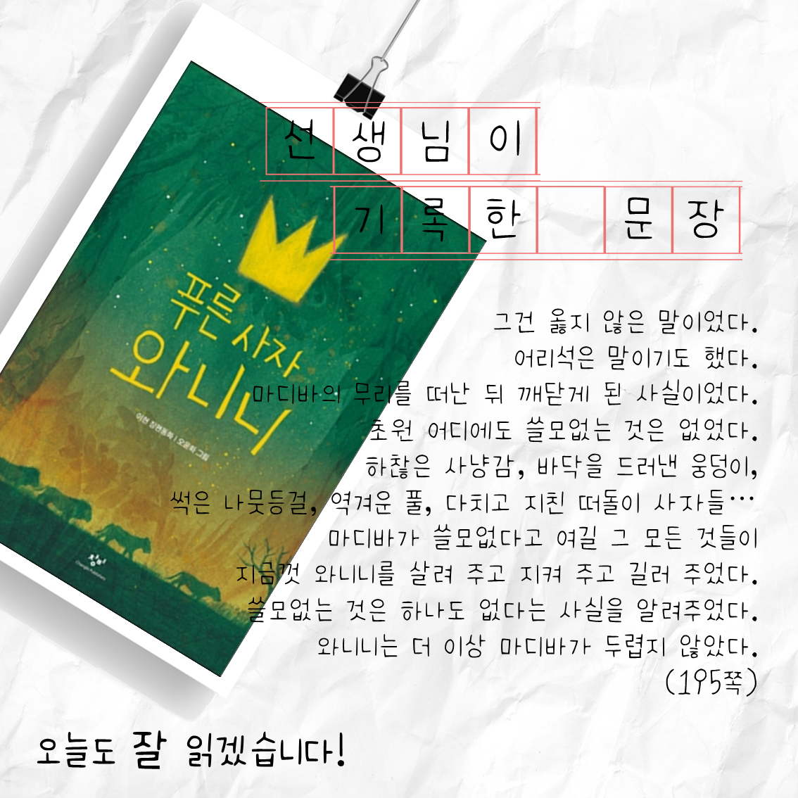 하나, 여러분들이 <푸른 사자 와니니> 책을 읽는 모습이 궁금해요. 구글 포토에 인증샷을 한번 남겨 볼까요? 학교 도서관에서 빌린 책, 공공 도서관에서 빌린 책, 직접 구입한 책 등 어떤 것도 괜찮아요. 내가 읽고 있는 책의 모습을 사진으로 담아 구글 포토에 공유해 주세요. 방학 기간, 나와 함께 같은 책을 읽고 있는 친구들을 만날 수 있을 거예요!