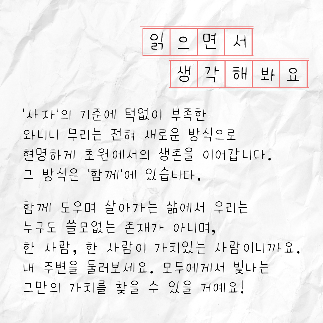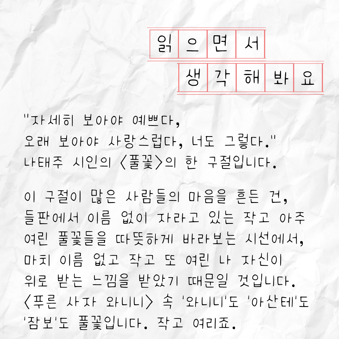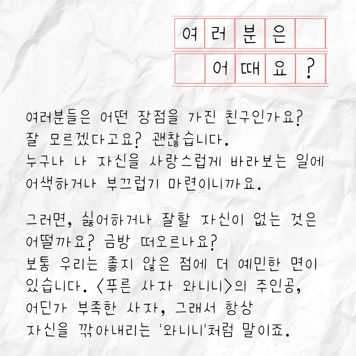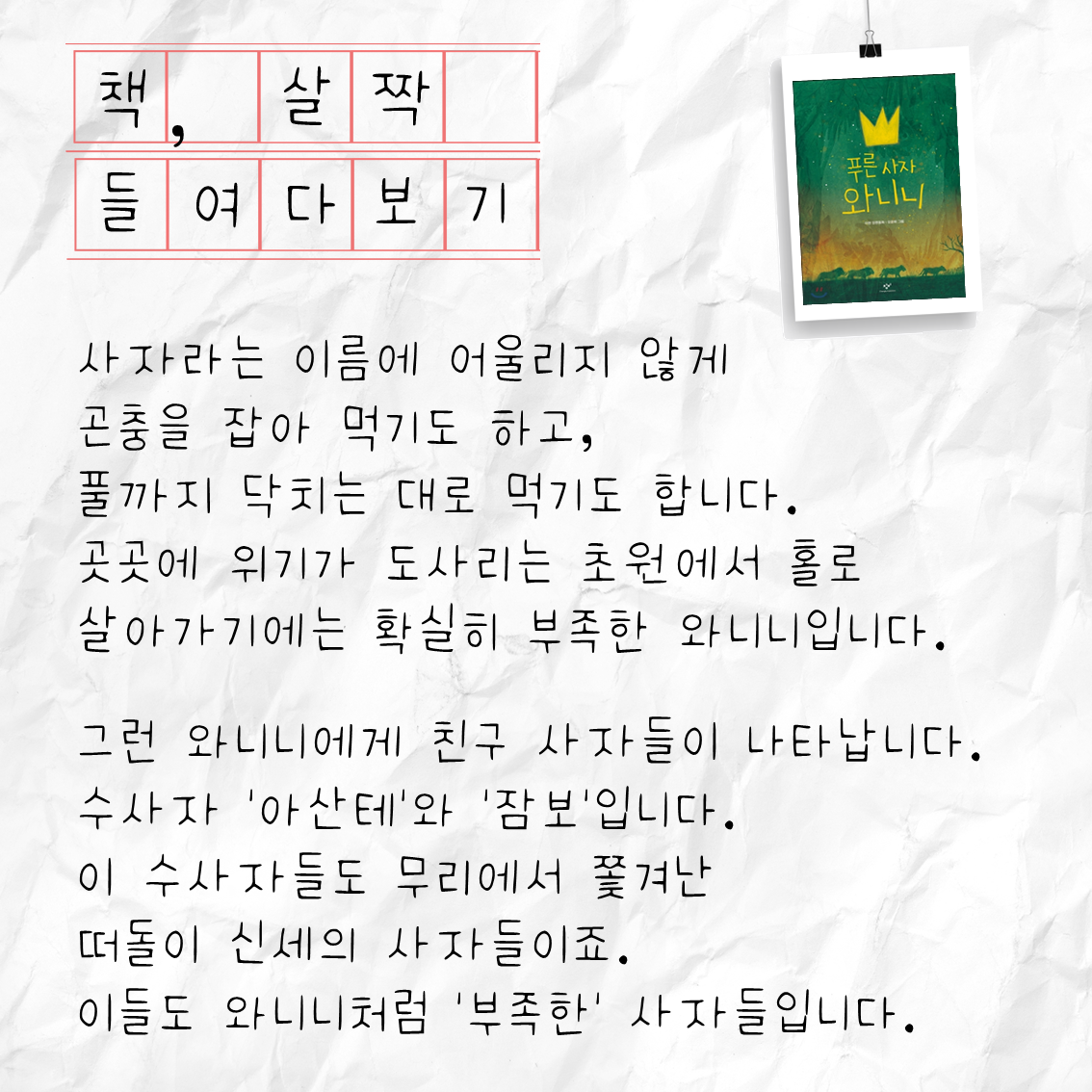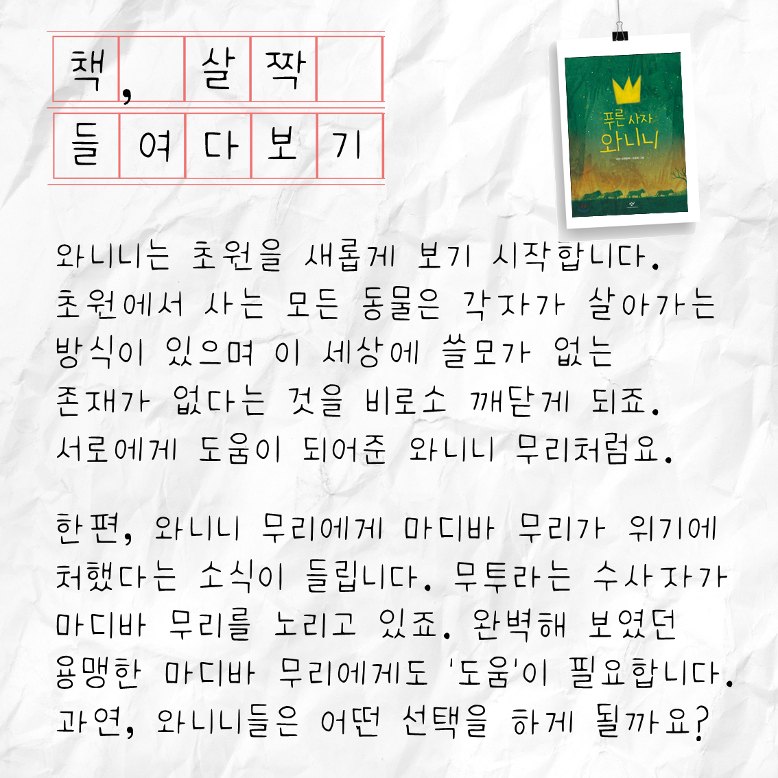 둘, <푸른 사자 와니니>, 어땠나요? 몇 가지 물음에 답하면서 여러분들의 생각을 정리하면서 책 읽기를 마무리하여 봅시다.