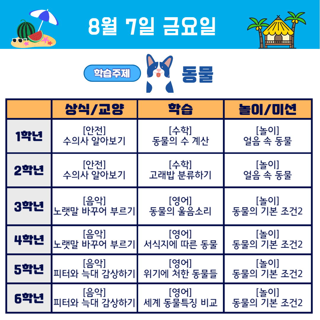 여름방학 2주차 (8.3~7) 학교가자 주제중심 프로젝트, 동물편 학습계획을 안내합니다.