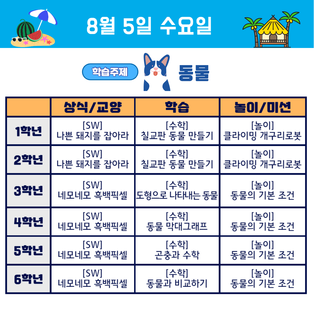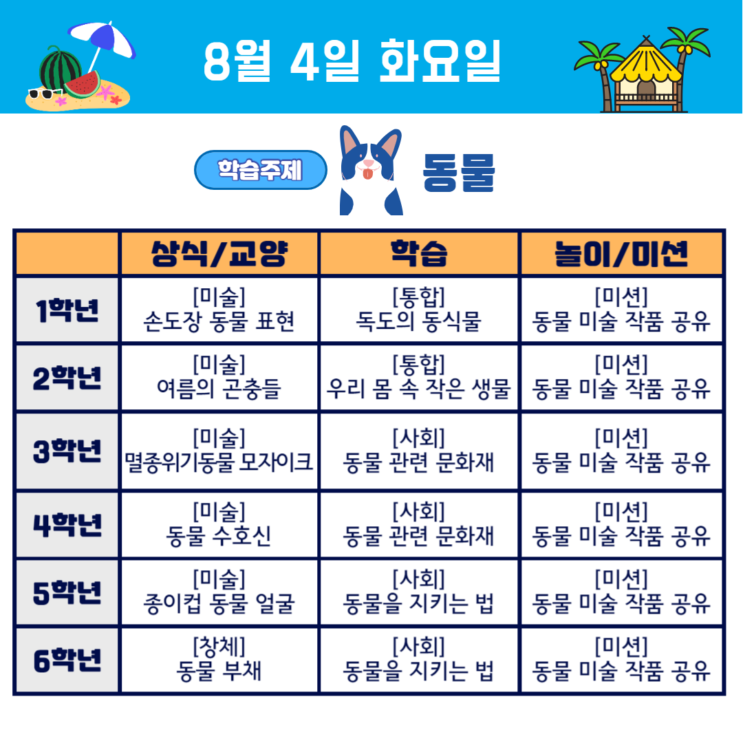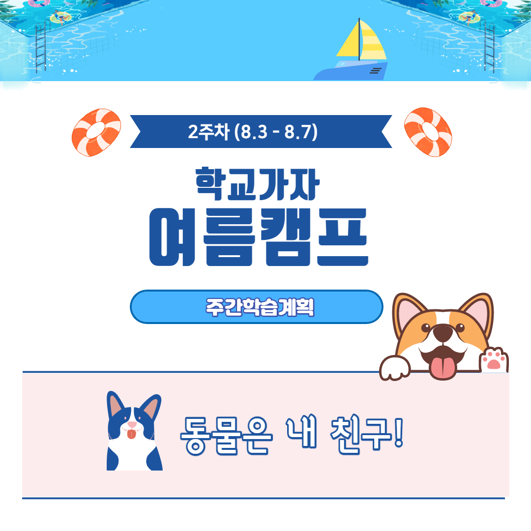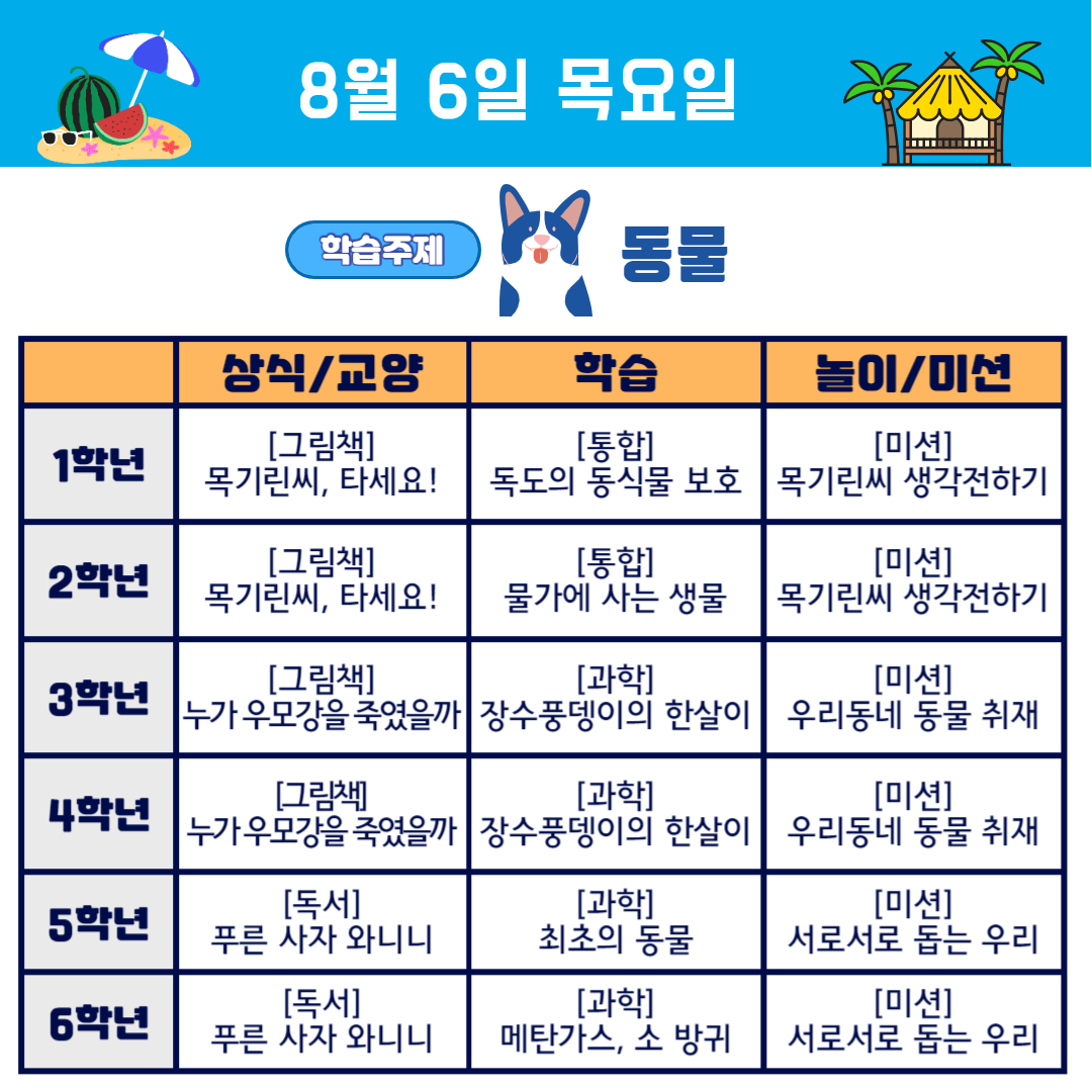 여름방학 2주차 (8.3~7) 학교가자 주제중심 프로젝트, 동물편 학습계획을 안내합니다.