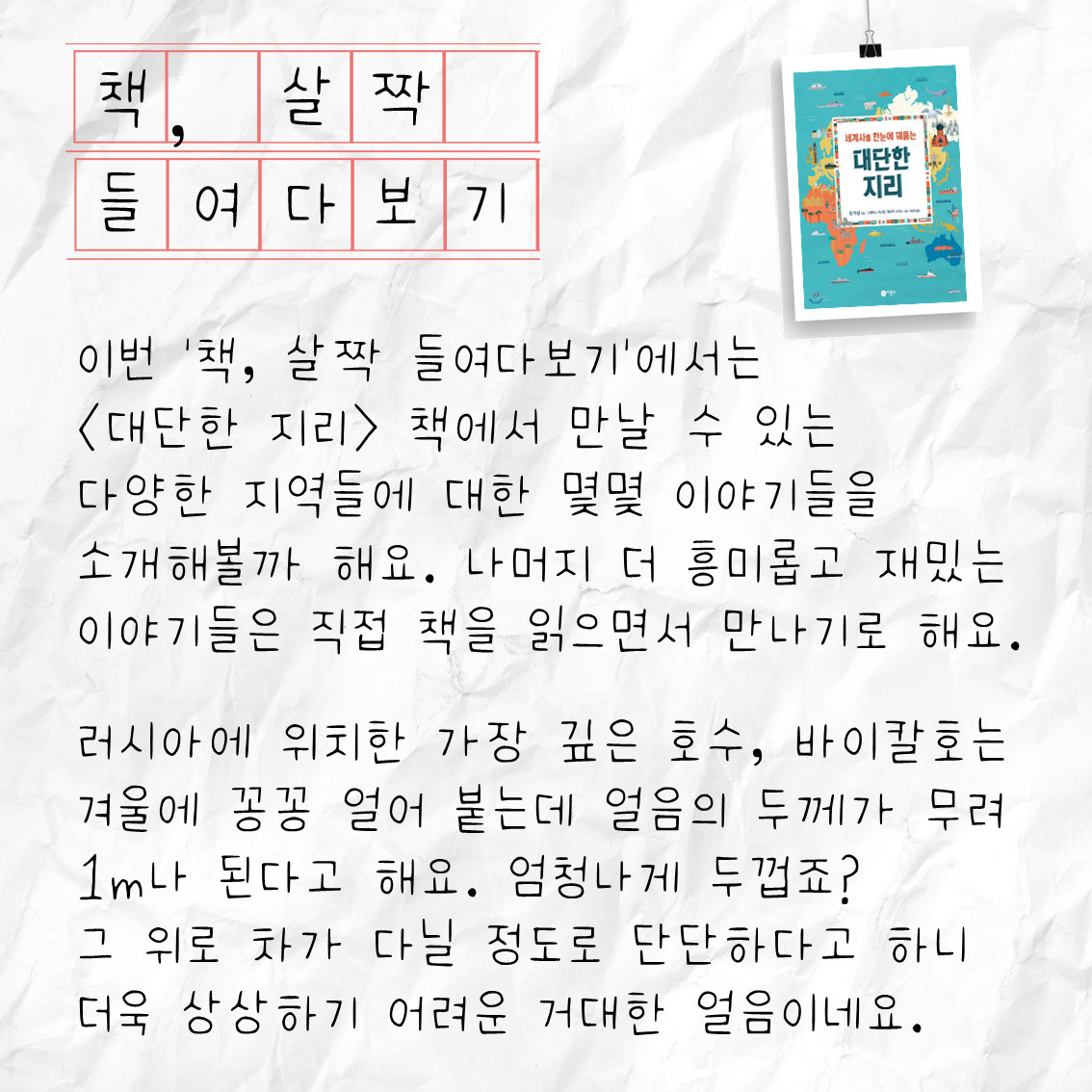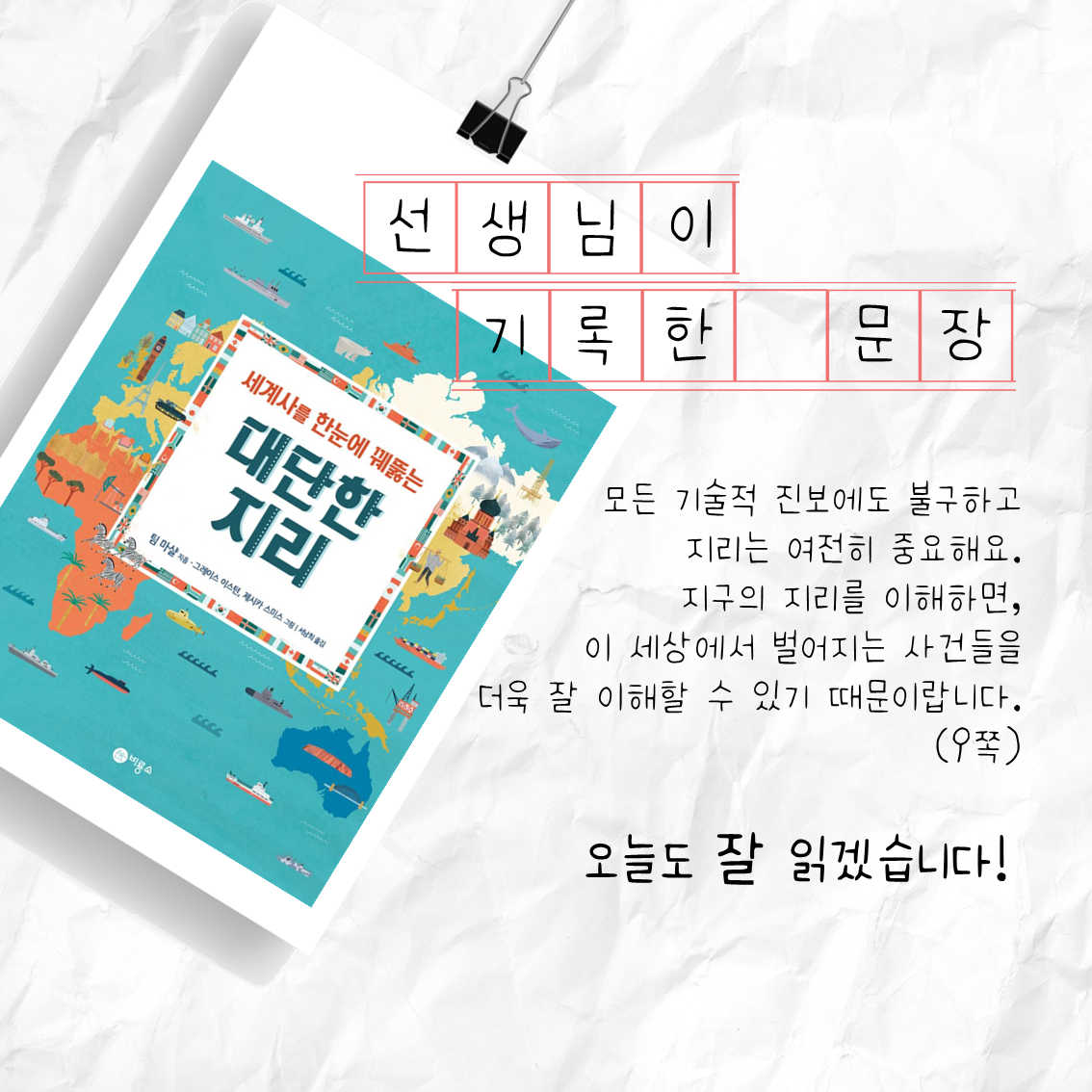 하나, 여러분들이 <대단한 지리> 책을 읽는 모습이 궁금해요. 구글 포토에 인증샷을 한번 남겨 볼까요? 학교 도서관에서 빌린 책, 공공 도서관에서 빌린 책, 직접 구입한 책 등 어떤 것도 괜찮아요. 내가 읽고 있는 책의 모습을 사진으로 담아 구글 포토에 공유해 주세요. 방학 기간, 나와 함께 같은 책을 읽고 있는 친구들을 만날 수 있을 거예요!