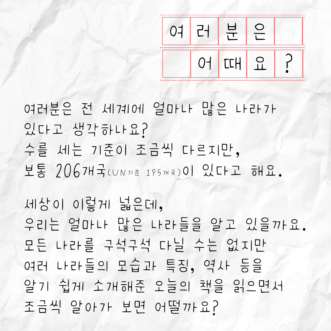 셋, <대단한 지리>를 읽으니 몸이 근질근질 마음은 싱숭생숭 가보고 싶은 나라가 한두 곳이 아니지요? 책을 읽으면서 꼭 가보고 싶다고 생각했던 나라를 떠올려 보세요. 그리고 그렇게 생각한 이유까지 함께 알려주세요. 과연 가장 인기가 많은 나라는 어디일까요?