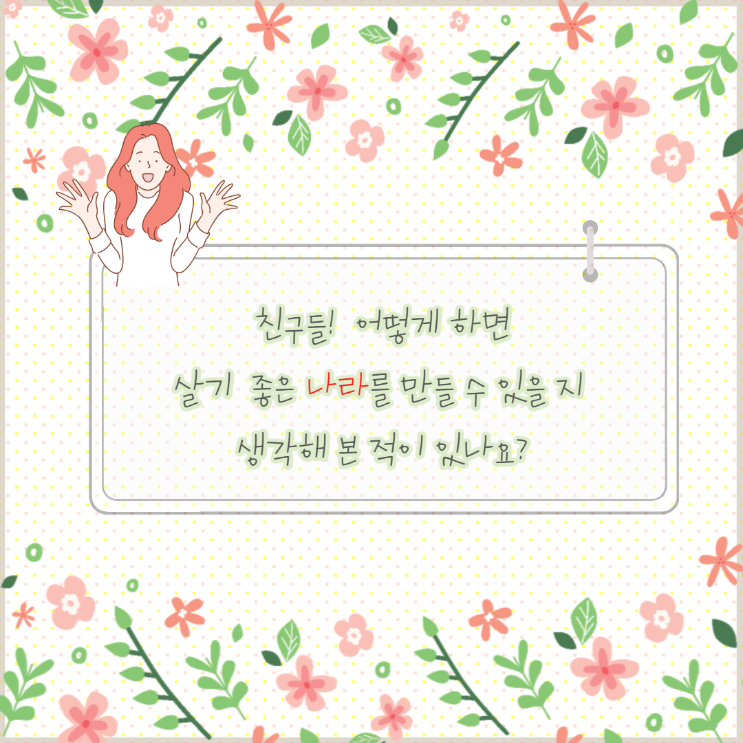 아름다운 나라를 만들기 위해, 내가 할 수 있는 일은 무엇인지 생각해보며 아래 질문에 자유롭게 답해보아요!