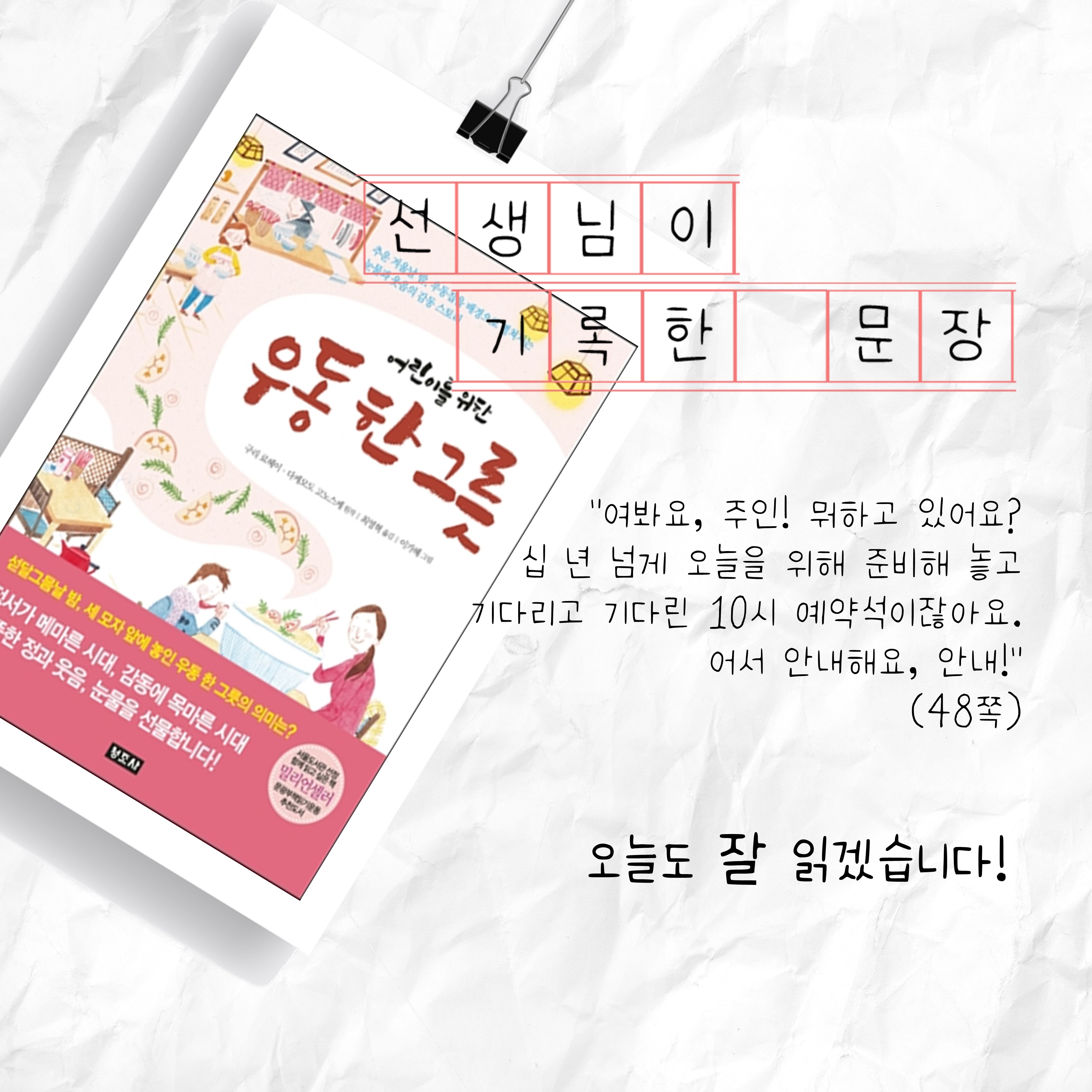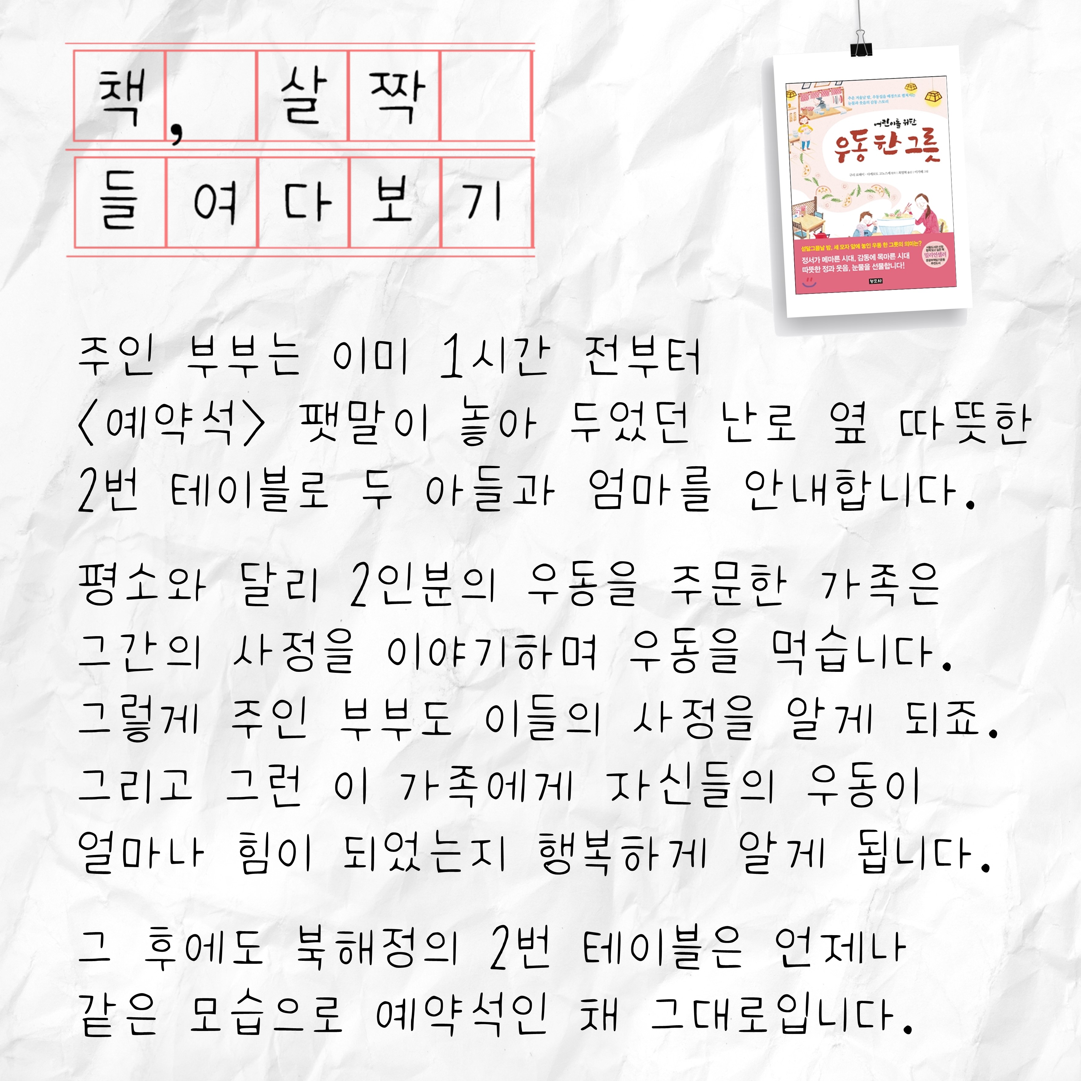 둘,<우동 한 그릇>, 어땠나요? 몇 가지 물음에 답하면서 여러분들의 생각을 정리하면서 책 읽기를 마무리하여 봅시다.