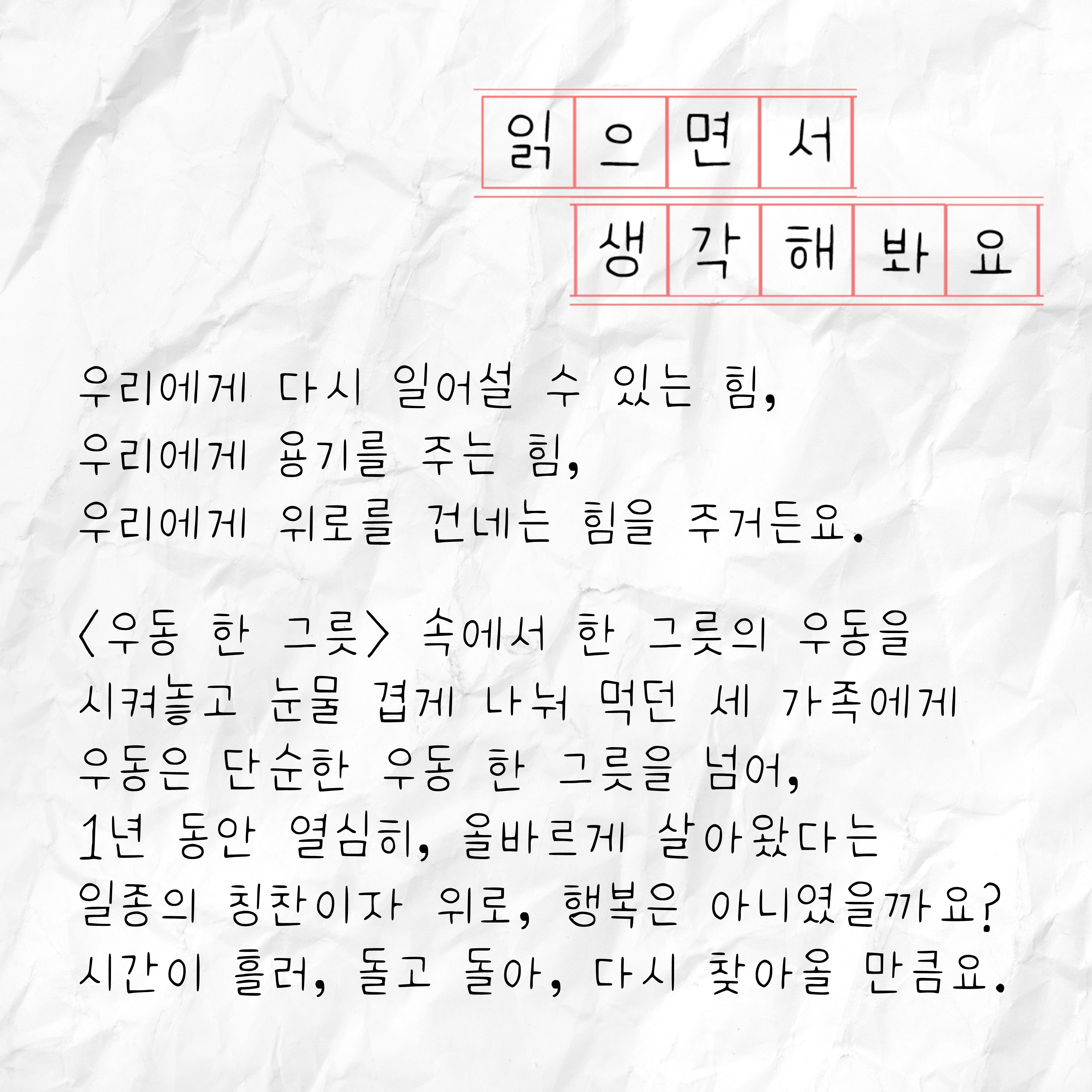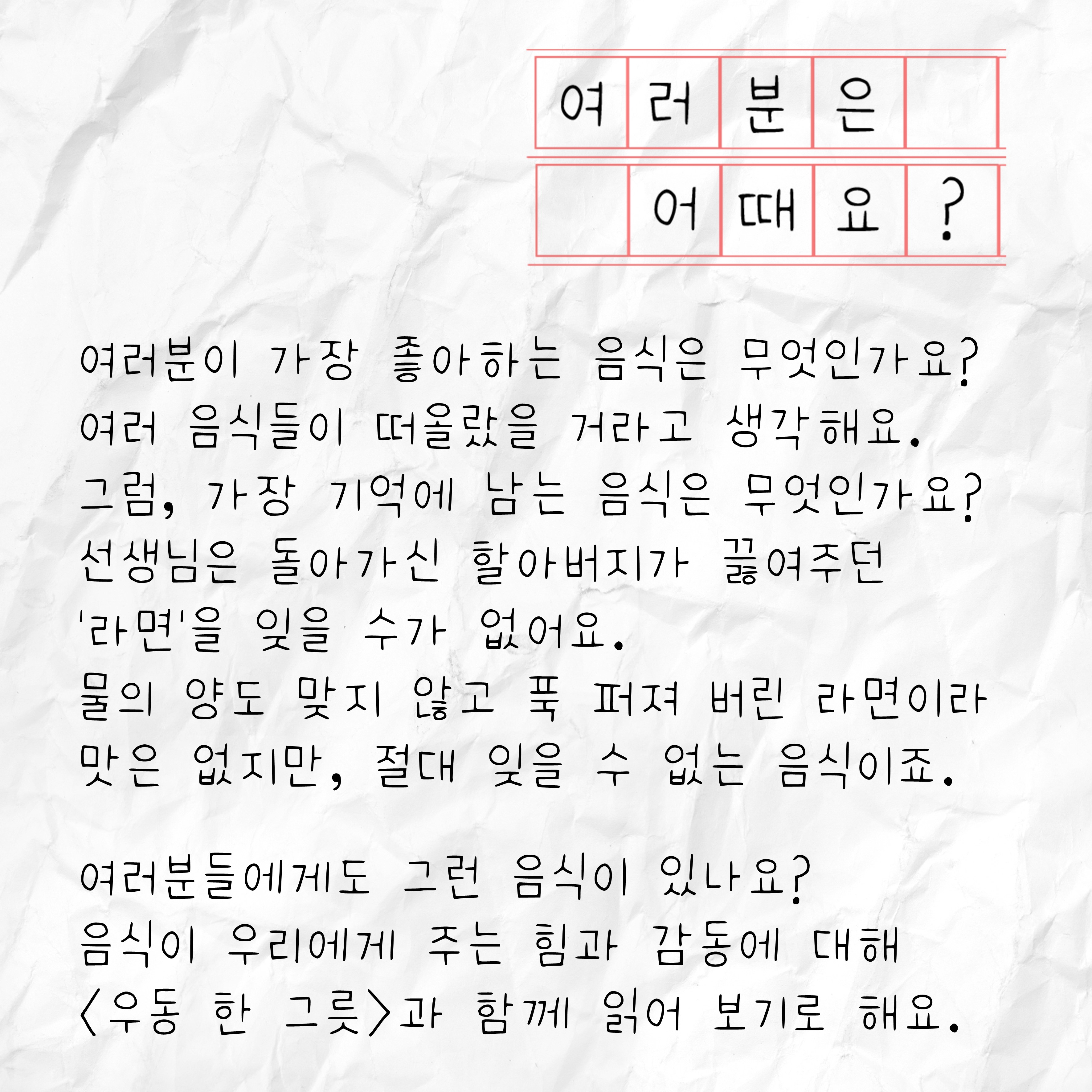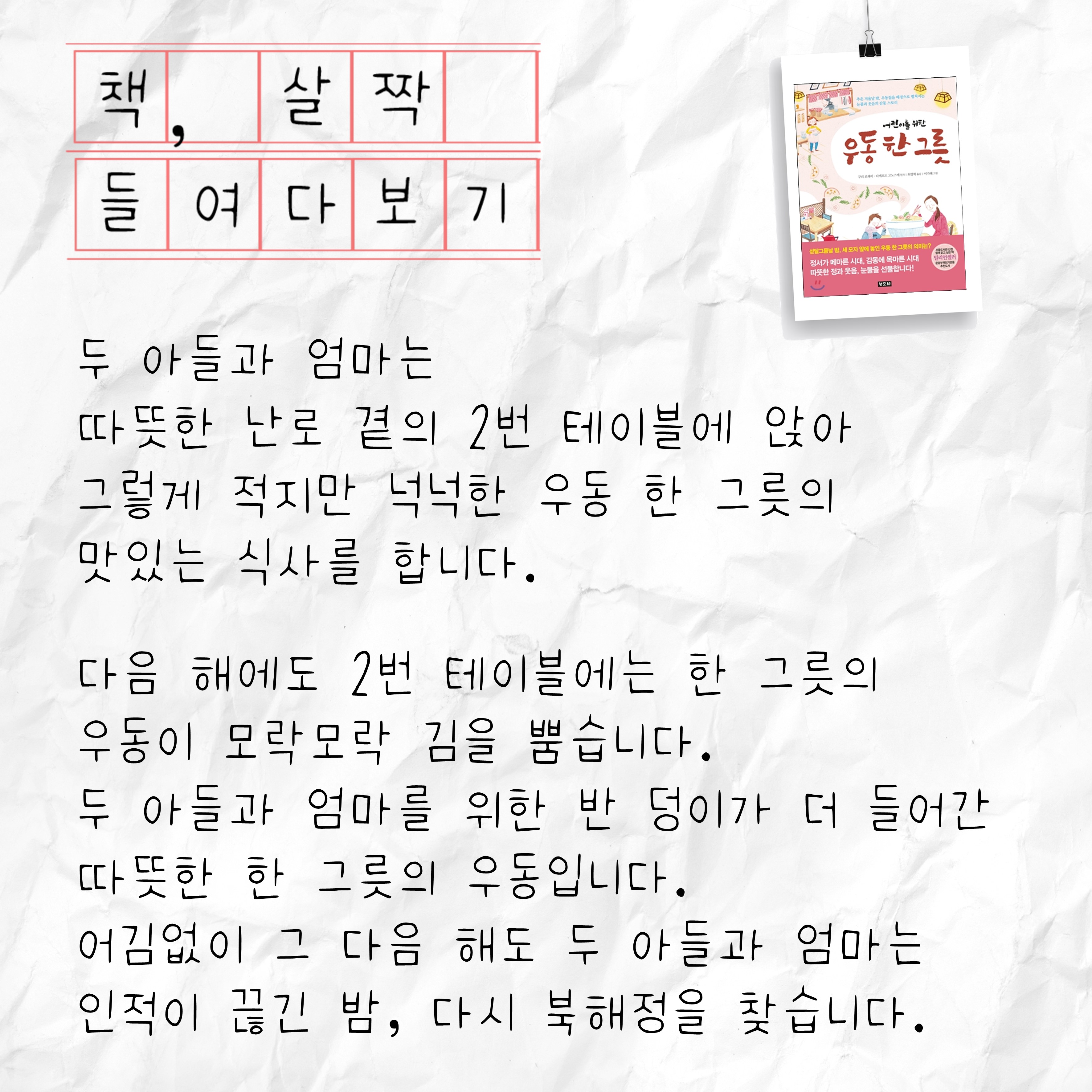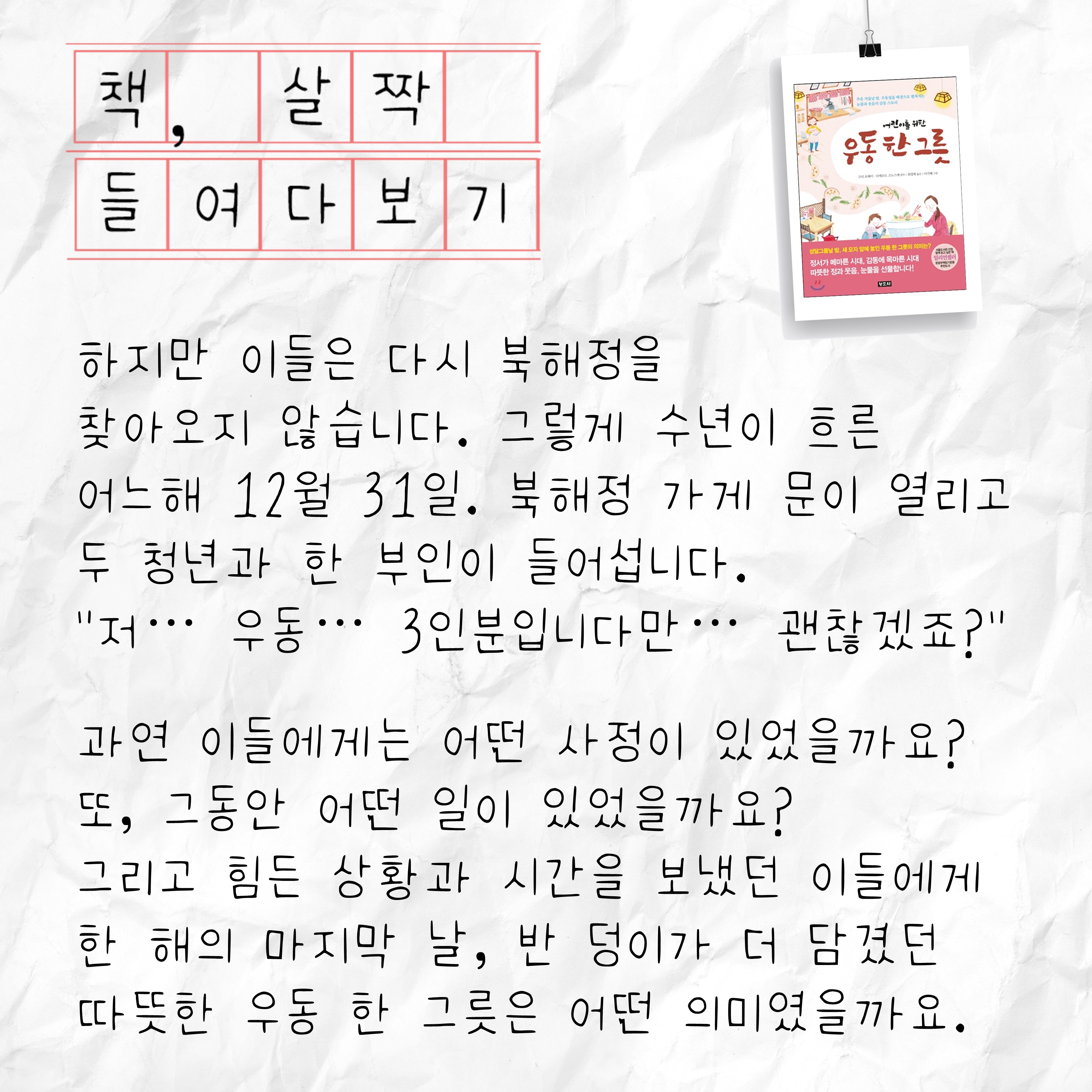 둘,<우동 한 그릇>, 어땠나요? 몇 가지 물음에 답하면서 여러분들의 생각을 정리하면서 책 읽기를 마무리하여 봅시다.