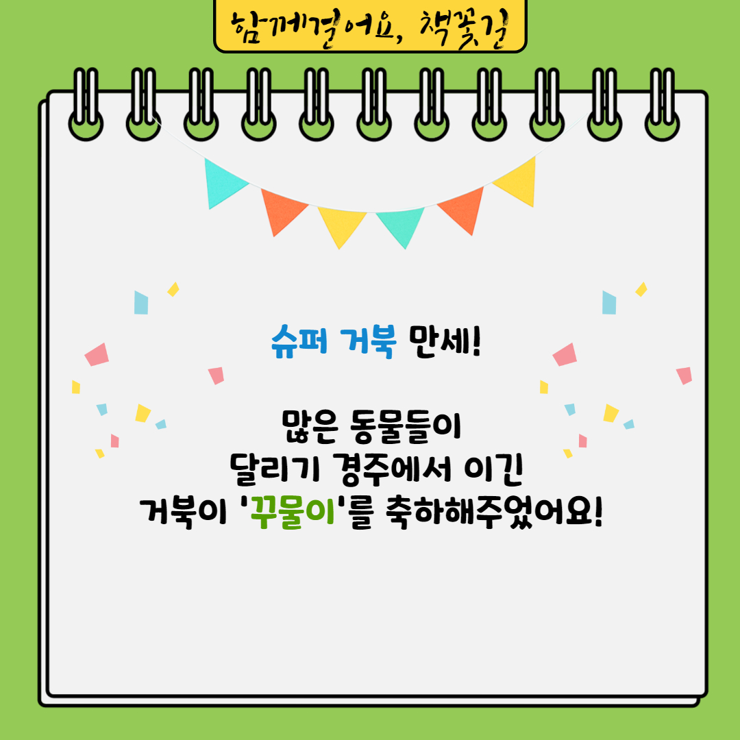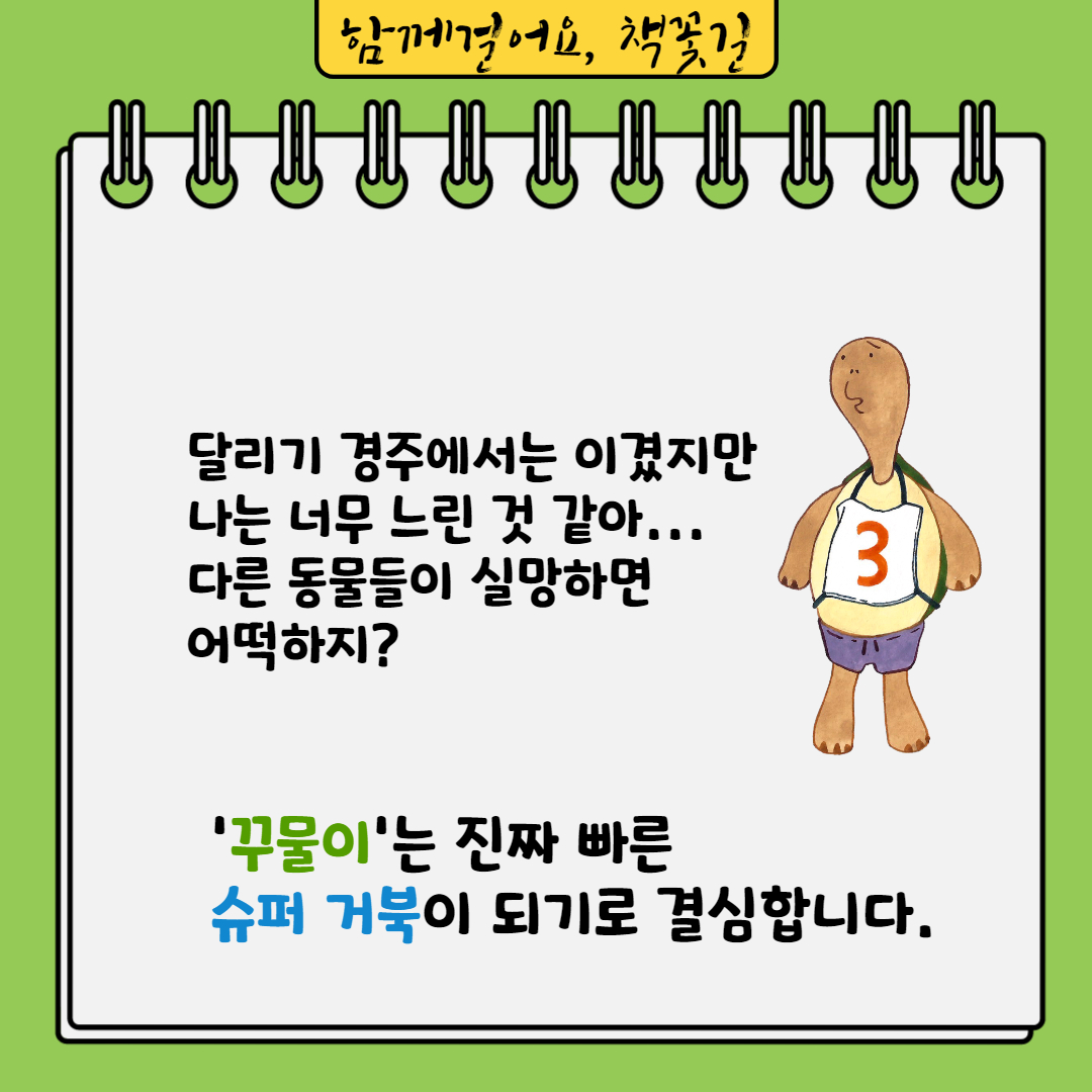 이번주에 함께 나누게 된 책은 벼락 스타가 된 '꾸물이'가 주인공으로 나오는 <슈퍼 거북>입니다.
