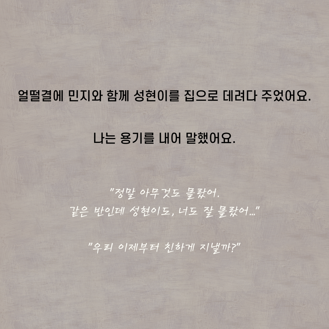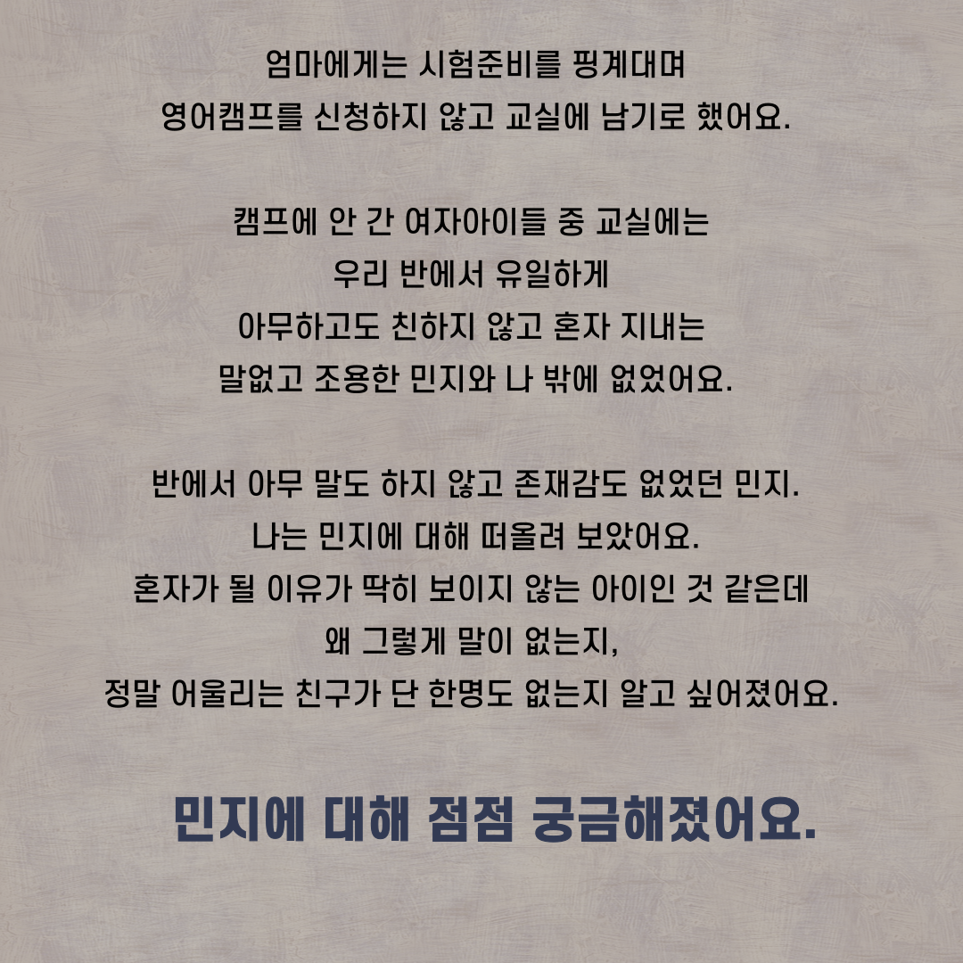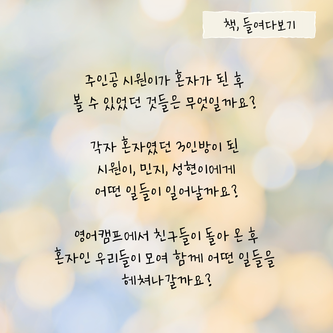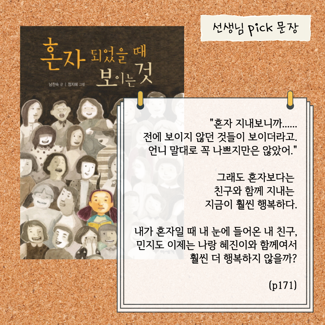 여러분 책 재미있게 읽었나요~? 선생님은 여러분이 이 책을 통해 학교에서 혼자인 존재들에 대해 깊이 생각해보고, 함께가 되어줄 수 있는 용기와 따뜻한 마음을 가진 친구들로 한층 성장하기를 바랍니다♥