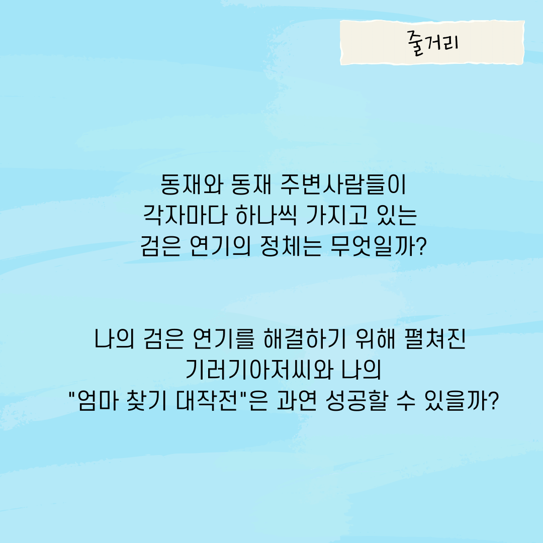책 재미있게 읽었나요? 선생님은 여러분이 이 책을 통해 여러분도 여러분만의 검은연기가 무엇인지 되돌아보고 스스로 보듬어줄 수 있었으면 좋겠어요. 그리고 동재와 주변 사람들이 서로의 아픔을 공유하고 함께 해결해나가는 모습처럼 여러분도 주변사람의 검은연기도 함께 보듬어주고 환기시켜줄 수 있는 사람이 되었으면 좋겠습니다.