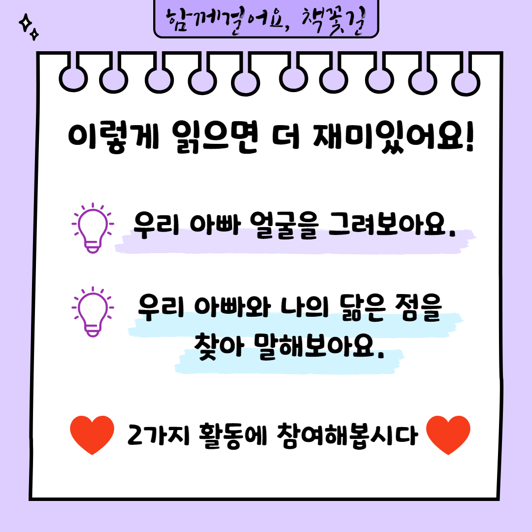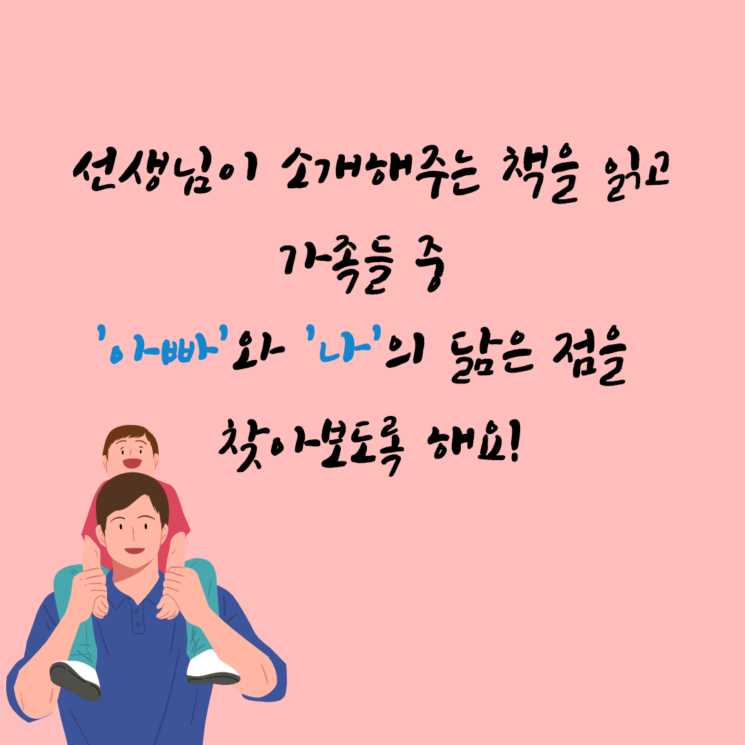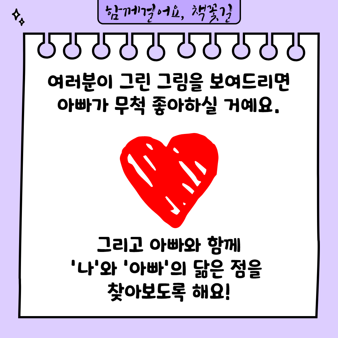 이 책을 읽고 '우리 아빠'의 얼굴을 직접 그려보고, '나의 어떤 부분'이 우리 아빠와 닮았는지 함께 이야기해보는 시간을 가졌으면 좋겠어요!