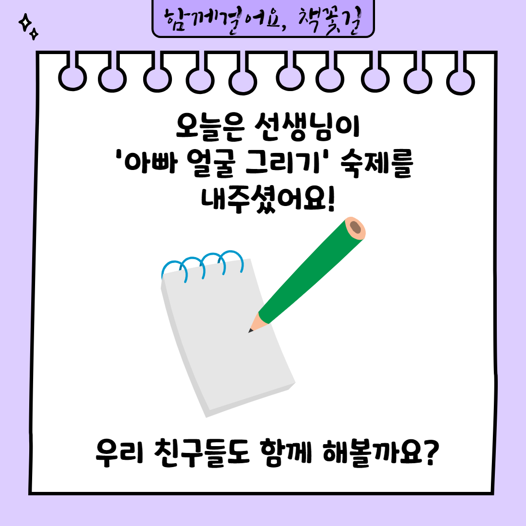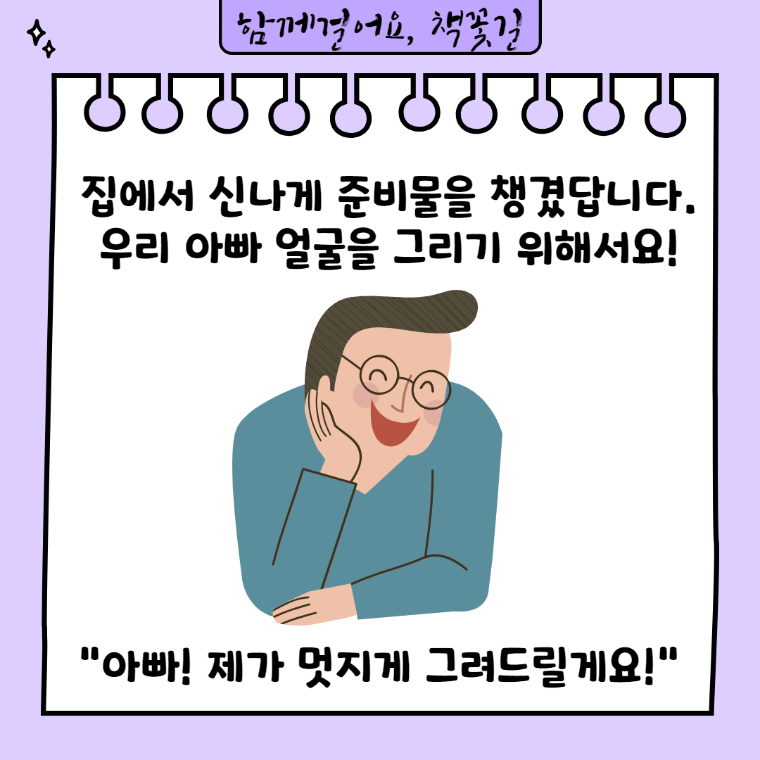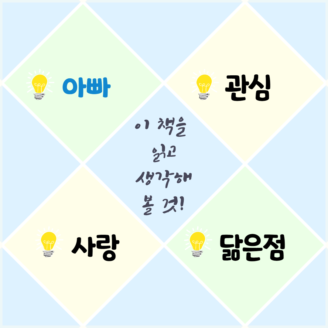 이 책을 읽고 '우리 아빠'의 얼굴을 직접 그려보고, '나의 어떤 부분'이 우리 아빠와 닮았는지 함께 이야기해보는 시간을 가졌으면 좋겠어요!