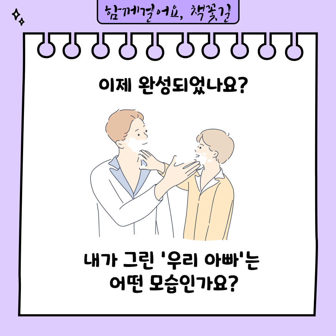 이 책을 읽고 '우리 아빠'의 얼굴을 직접 그려보고, '나의 어떤 부분'이 우리 아빠와 닮았는지 함께 이야기해보는 시간을 가졌으면 좋겠어요!