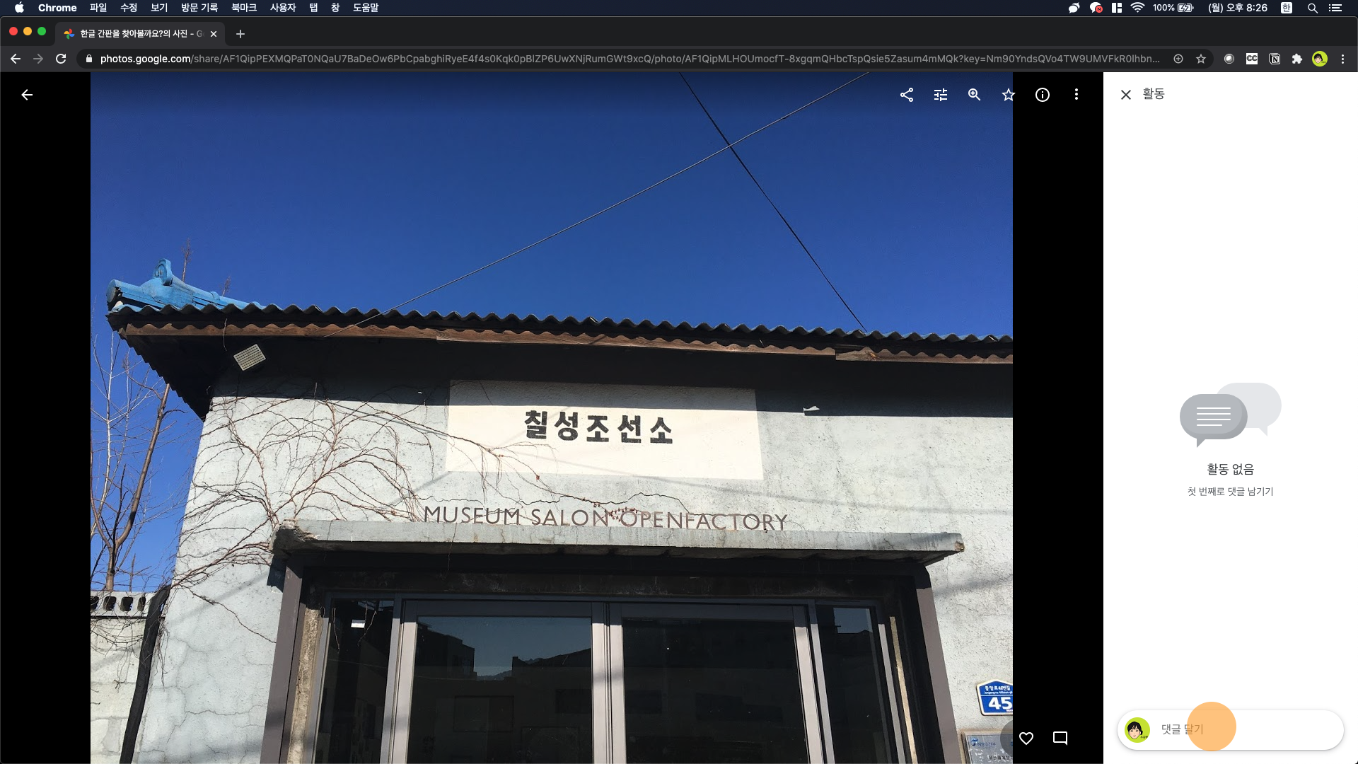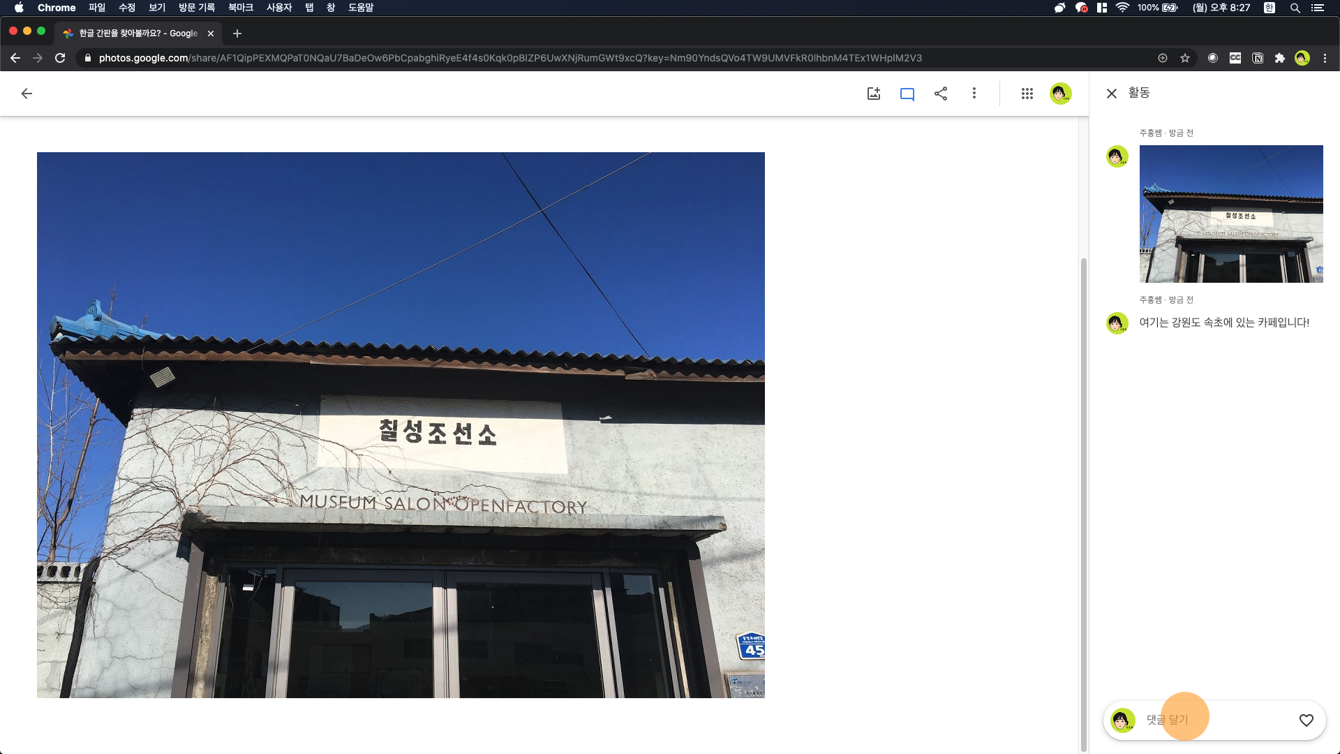 앨범 자체에 좋아요를 표시하려면 오른쪽 하단의 하트를 누릅니다. 댓글을 적으려면 앨범 화면 오른쪽 하단의 댓글 추가 버튼을 클릭합니다. 그러면 오른쪽 화면처럼 일종의 앨범에 대한 댓글창이 나타납니다. 시간 순서에 따라 어떤 사진이나 동영상이 올라왔는지, 누가 어떤 댓글을 썼는지가 나타납니다. 일종의 앨범 전체에 대한 단체 채팅창이라고 생각하시면 되겠습니다.