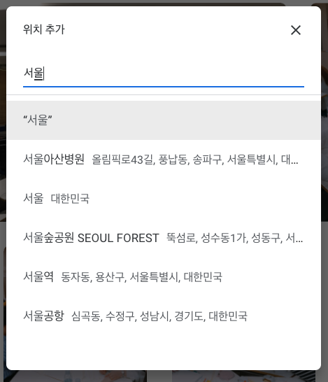 - 앨범에 대한 위치 정보를 추가합니다. 이 버튼을 누르면 아래와 같이 위치, 지도, 모든 추천 위치가 나타납니다.