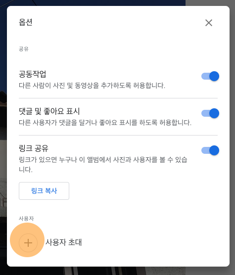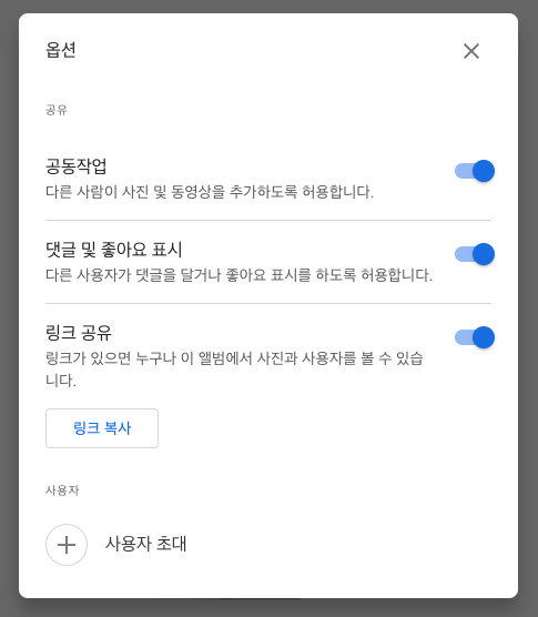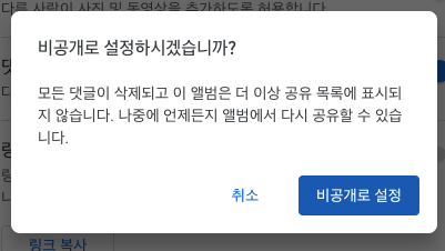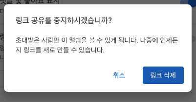 - 링크 공유: 링크 공유 기능을 켜면 URL만 안다면 누구나 이 앨범에 접근할 수 있습니다. 여기서 조심해야할 점이 있습니다.