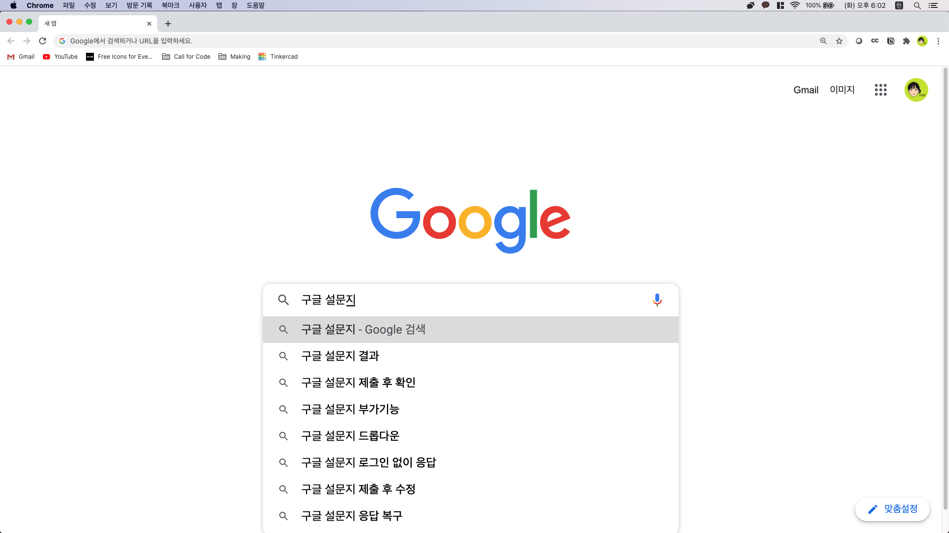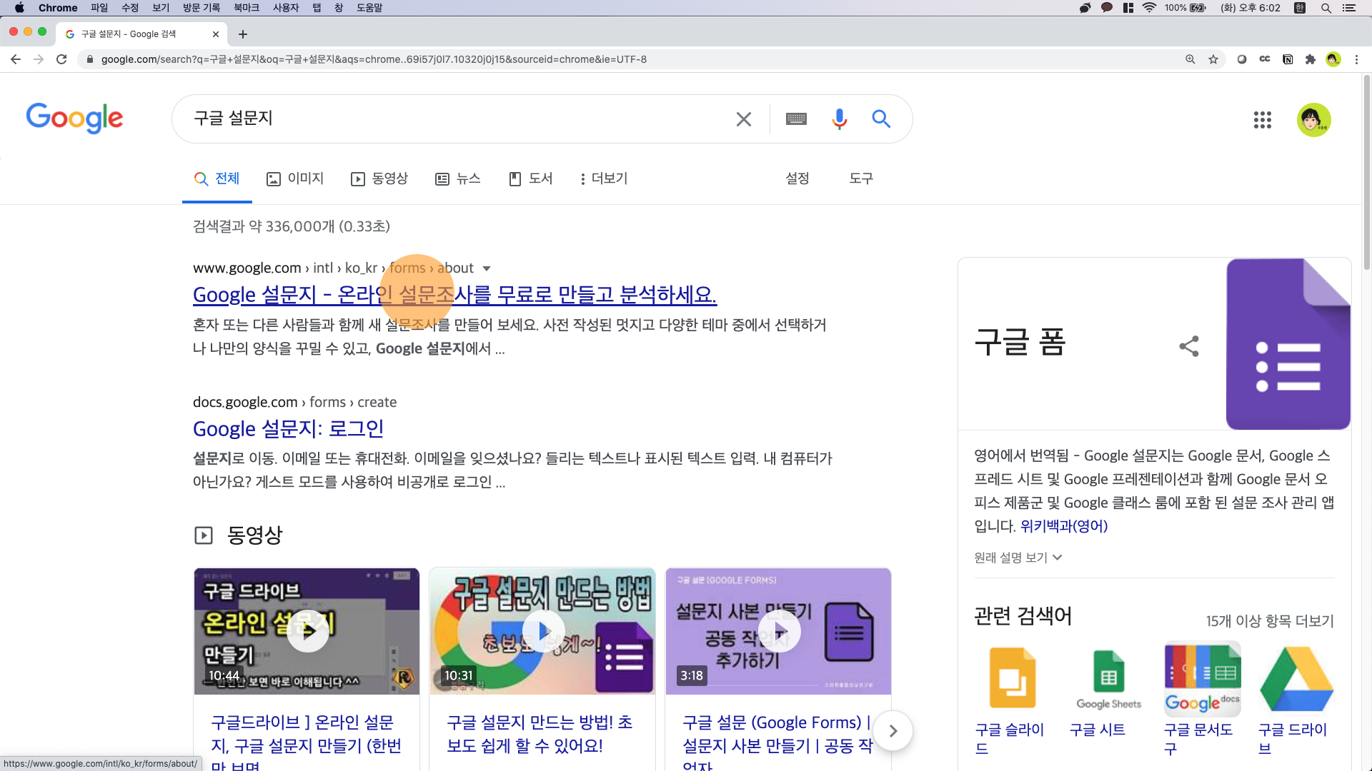 크롬을 사용하고 있다면, 오른쪽 상단에 '이미지'와 프로필 사진 사이의 점 9개 버튼을 클릭합니다. 하단으로 이동하여 설문지를 클릭합니다.